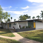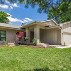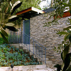 Idée de décoration pour une grande façade de maison verte vintage à un étage avec un revêtement en stuc, un toit en appentis et un toit en métal. — Houzz