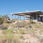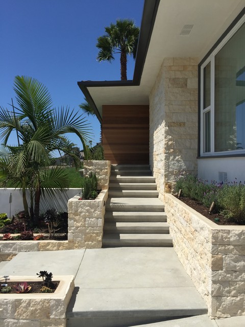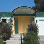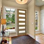 Cette image montre une porte d'entrée minimaliste avec un mur blanc, une porte pivot, béton au sol et une porte en bois clair. — Houzz