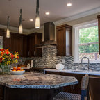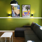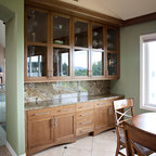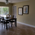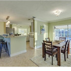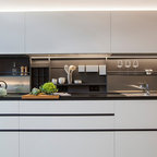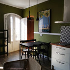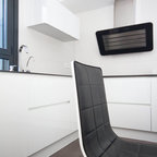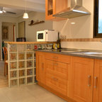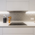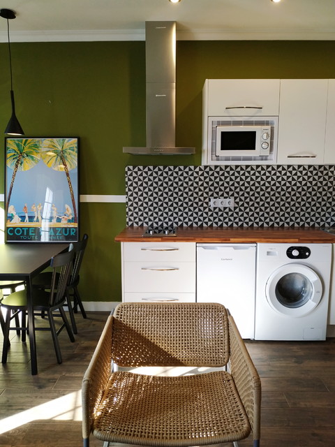 Inspiration pour une petite cuisine ouverte linéaire avec un évier posé, un placard à porte plane, des portes de placard blanches, un plan de travail en stratifié, une crédence noire, une crédence en carreau de céramique, un électroménager blanc, un sol en carrelage de céramique, aucun îlot, un sol marron et un plan de travail marron. — Houzz