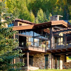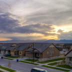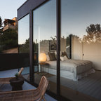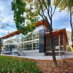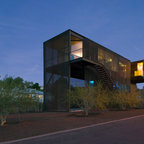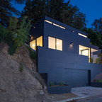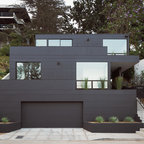 Cette photo montre une façade de maison noire moderne de taille moyenne et à deux étages et plus avec un revêtement en panneau de béton fibré, un toit plat et un toit végétal. — Houzz