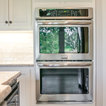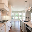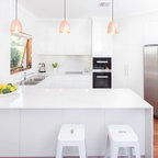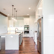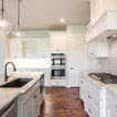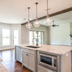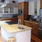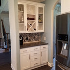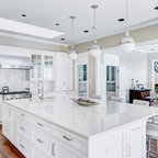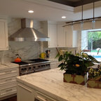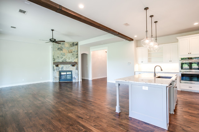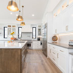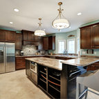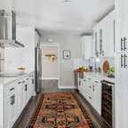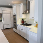 Cette image montre une cuisine ouverte traditionnelle en L de taille moyenne avec un évier encastré, un placard à porte shaker, des portes de placard blanches, un plan de travail en granite, une crédence blanche, une crédence en carrelage métro, un électroménager en acier inoxydable, un sol en bois brun, un îlot central et un sol marron. — Houzz