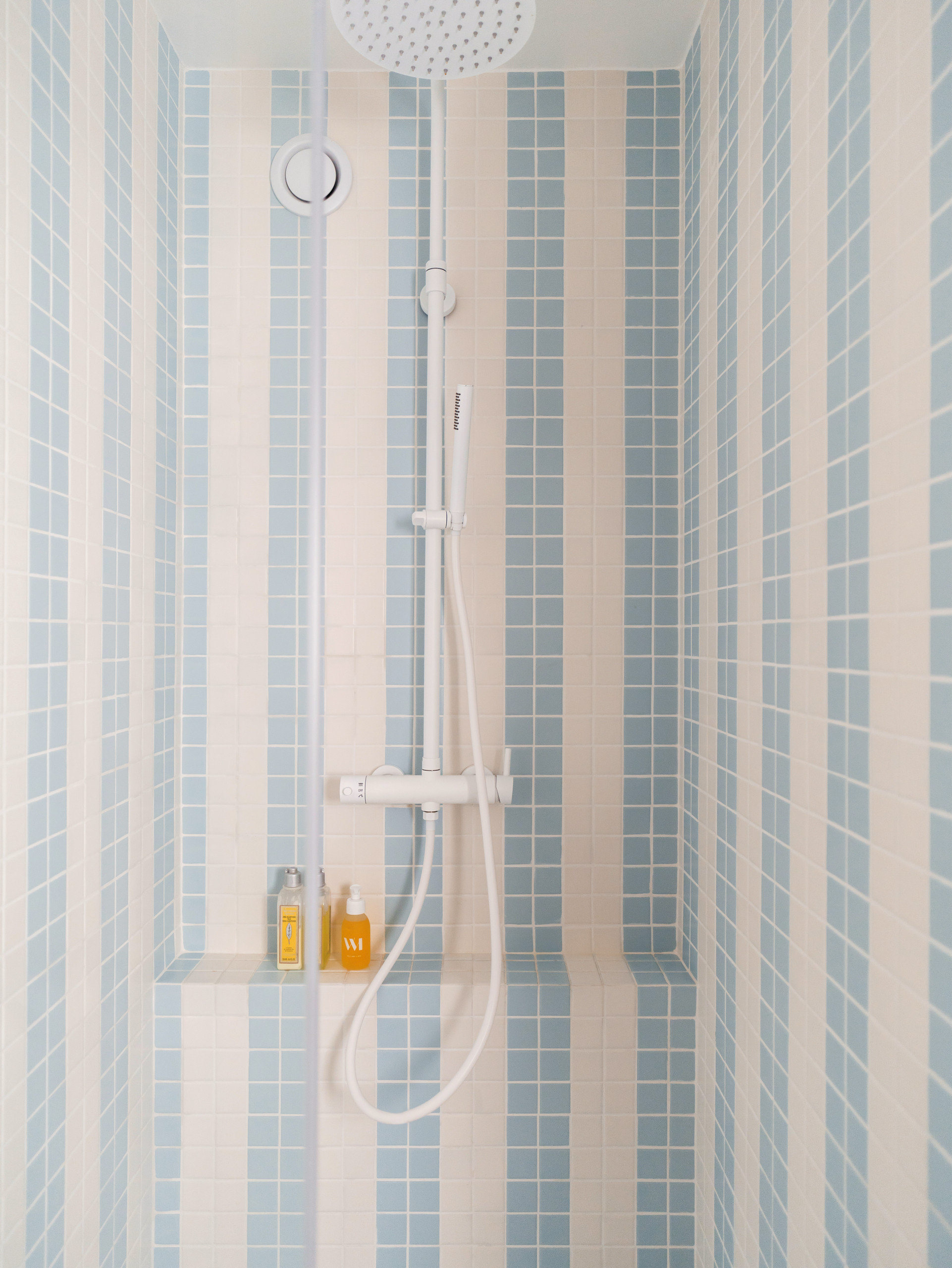 Pour faciliter l’entretien, privilégiez une assise de douche suspendue, comme ici un banc. Elle laissera l’eau s’évacuer sans la faire stagner, ce qui en plus d’être désagréable peut mettre à mal l’étanchéité de la douche à long terme.