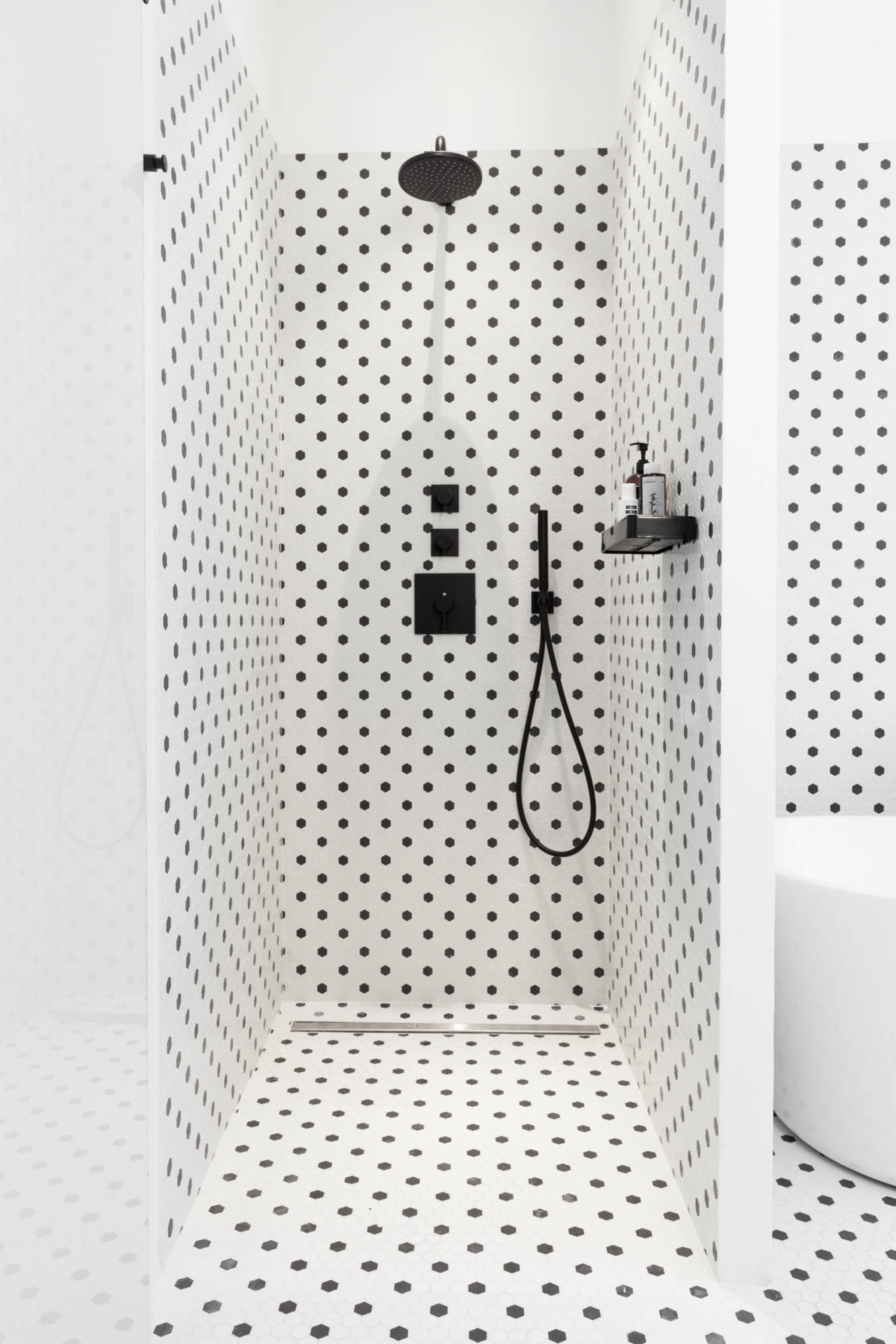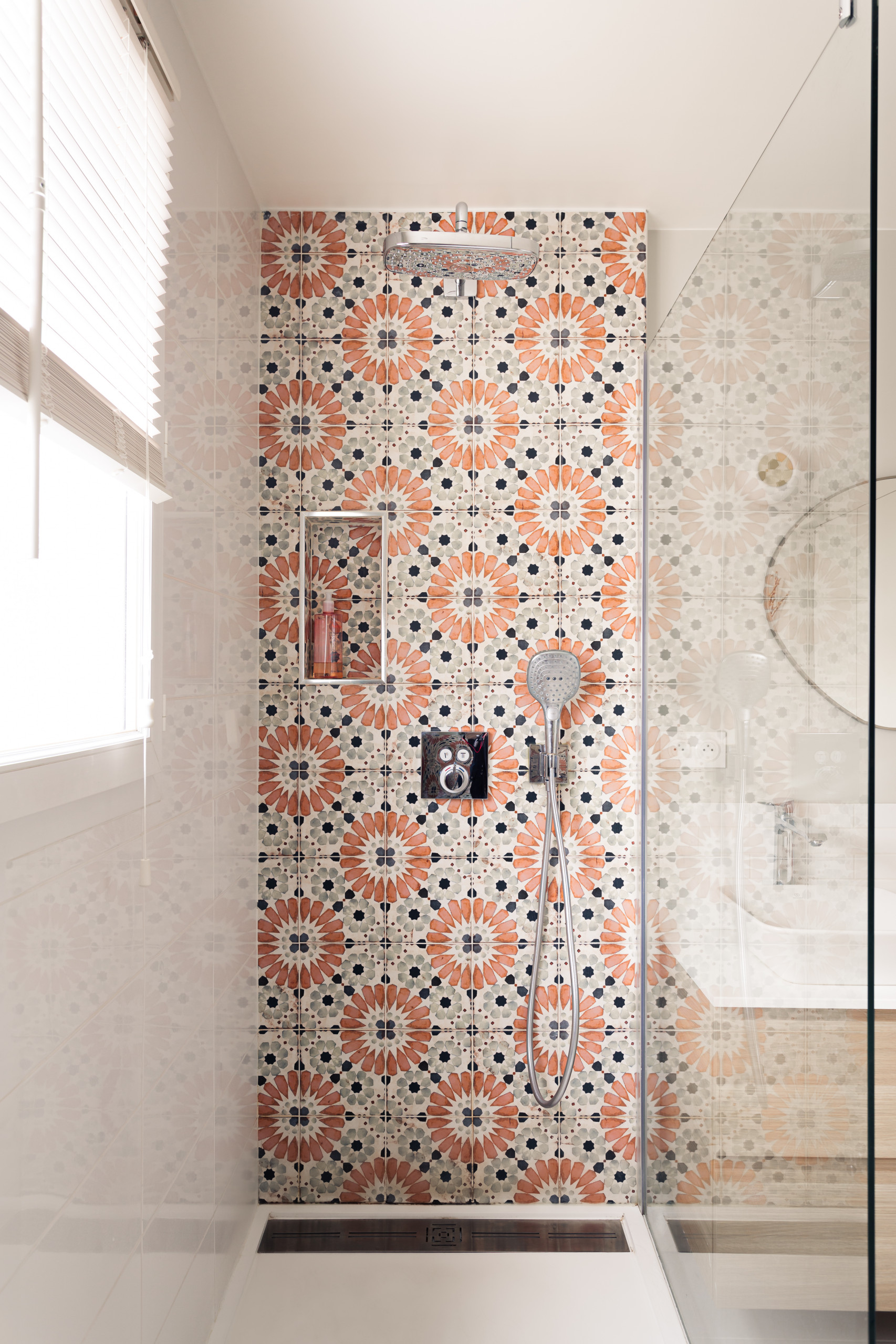 Pour être pratique et fonctionnelle, une douche doit être équipée de rangements et supports qui permettront d’accéder facilement aux produits de toilette et de les ranger. Une tablette carrelée au niveau de la colonne de douche, conçue en même temps que la douche pour créer une certaine unité, est une première solution.
