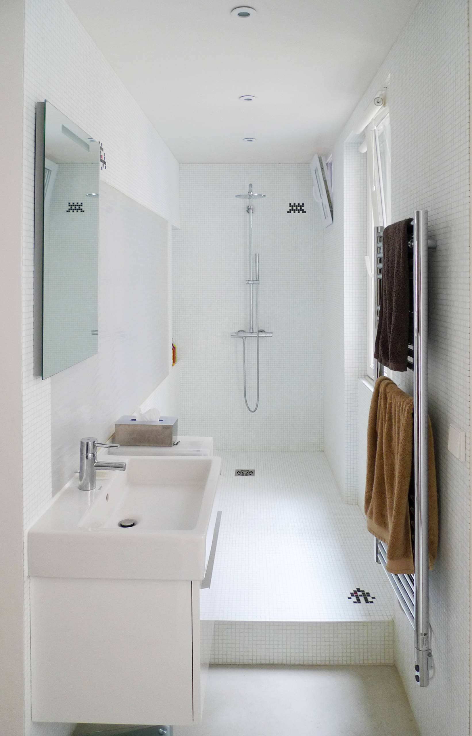L’entretien du verre peut rebuter certain car si on ne passe pas une raclette après chaque douche, la paroi s’opacifie rapidement sous l’effet du calcaire. La solution assez radicale pour pallier ce problème est de supprimer toute paroi ! Cette possibilité s’applique surtout pour les douches installées en profondeur, dans une salle de bains dite en couloir. Ce sont alors les murs latéraux qui font office de pare-douche et évitent une trop grande dispersion de l’eau. Dans ce cas, on aura une douche entièrement carrelée pour bien protéger les murs.