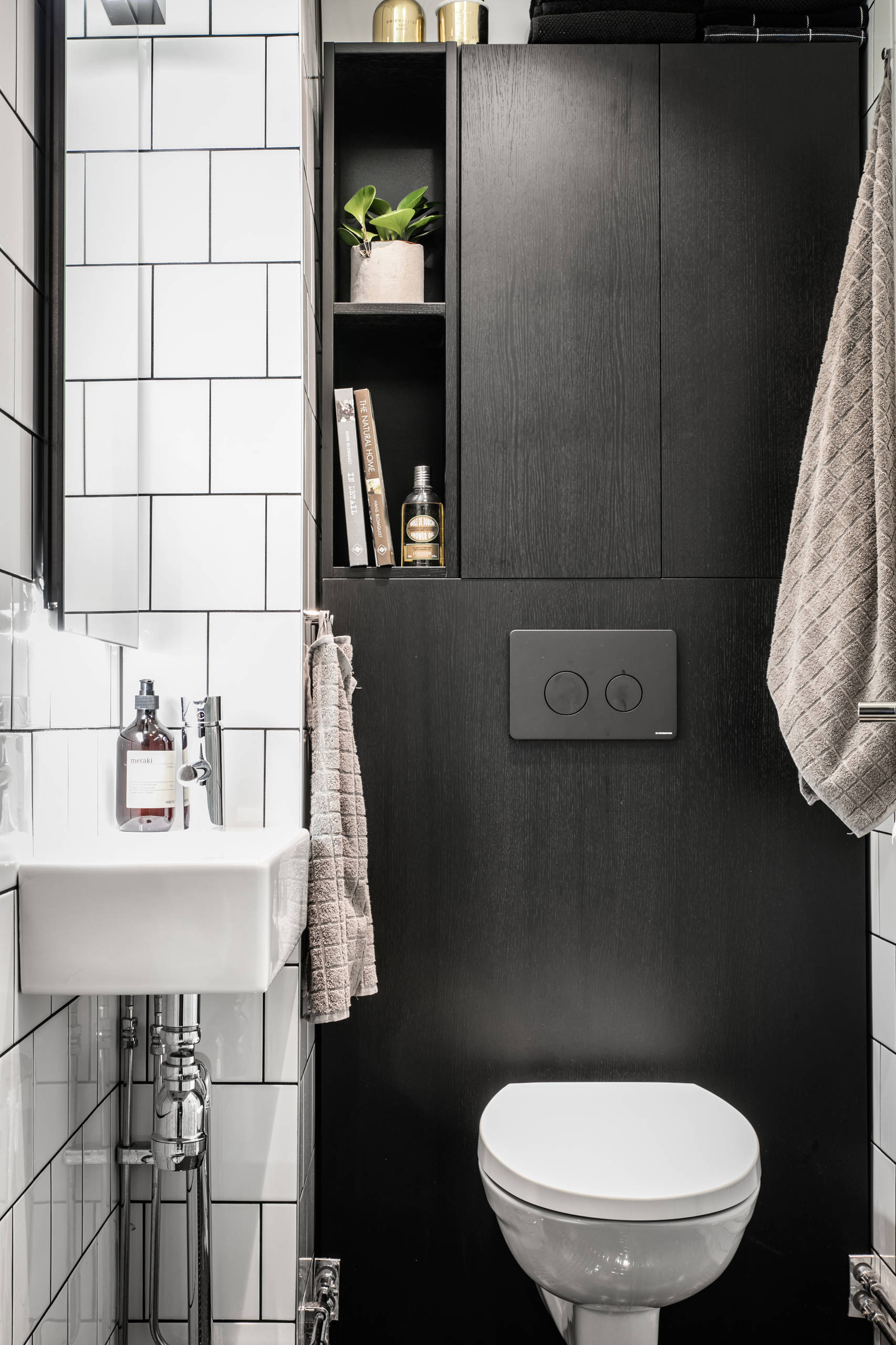 Les toilettes suspendues nécessitent la pose d’un bâti-support qui doit généralement être habillé. Cet espace d’environ 40 centimètres à l’arrière des WC peut très bien être utilisé sur toute la hauteur pour y intégrer des rangements. On peut opter pour des placards fermés et prendre le parti pris, comme ici, d’avoir un ensemble uniforme grâce à un placage en bois teinté en noir. On obtient alors des rangements invisibles et un fond de toilette homogène.