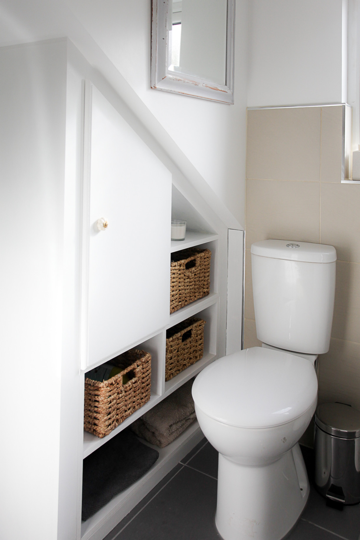 Ne nécessitant pas énormément d’espace, les toilettes trouvent facilement leur place dans les zones biscornues de la maison. On peut tirer profit de ces coins difficiles à aménager en créant des placards et autres rangements sur mesure. Sous les combles, une porte de placard suivra la pente et des petites niches peuvent abriter des paniers de rangement faciles d’accès et qui apporteront une touche décorative.