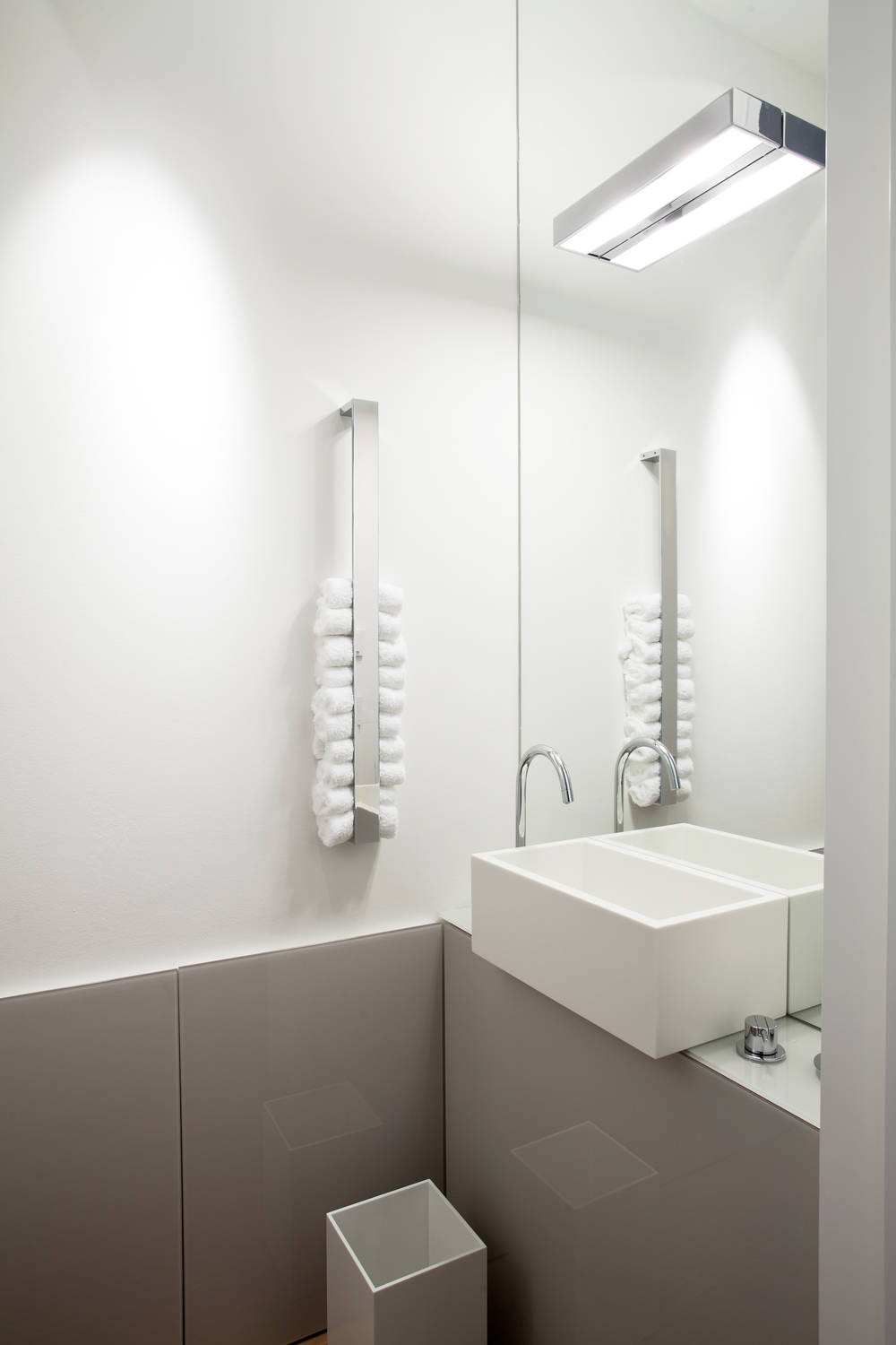 Les couleurs apportent un contraste qui donne de la profondeur et, contrairement aux idées reçues, amplifie la sensation de volume à condition que la peinture soit appliquée sur un mur unique. Un bleu profond fera ressortir par contraste des étagères a priori tout ce qu’il y a de plus simple, fixées au-dessus des WC.