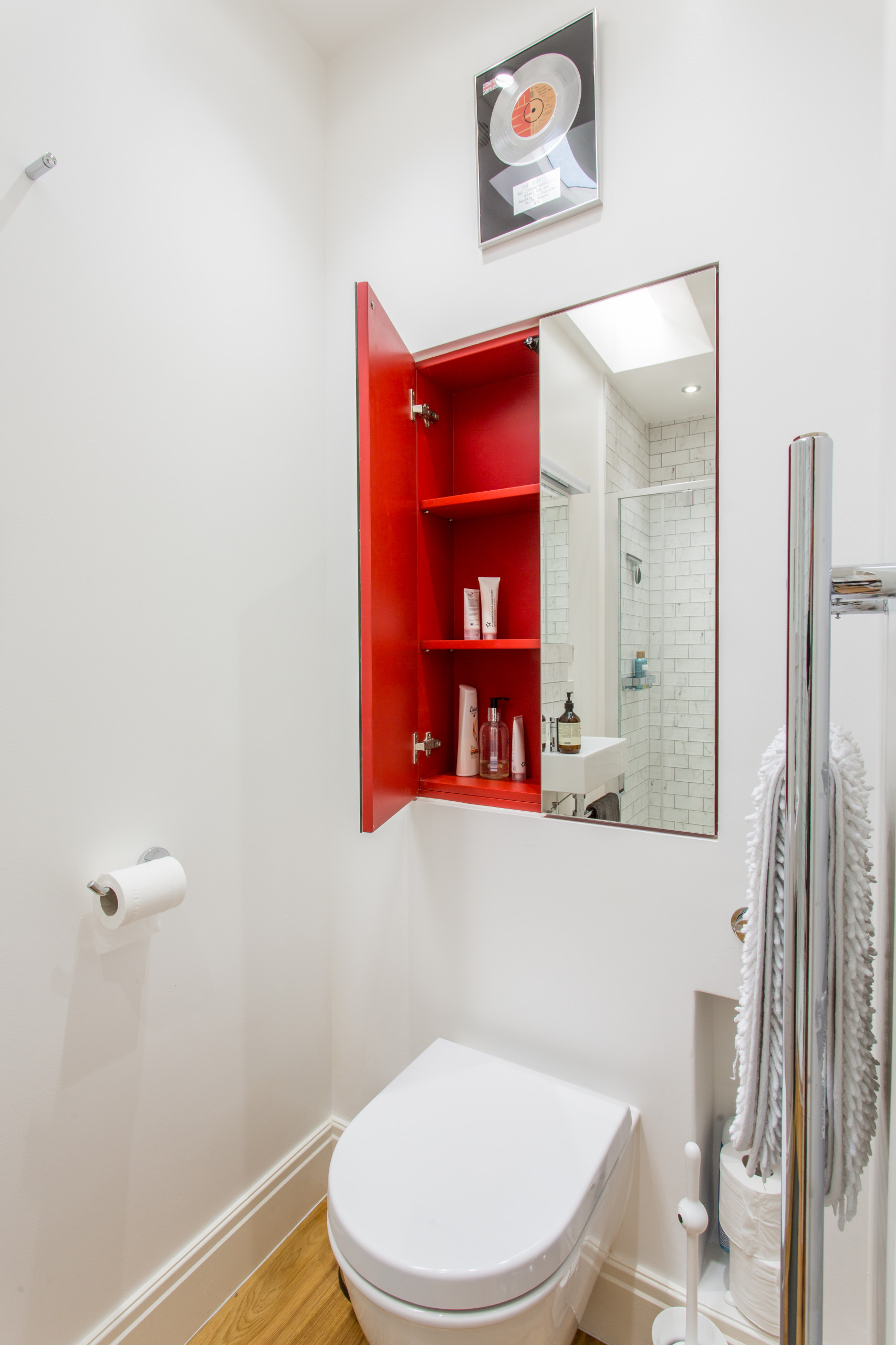 Qui a dit que le petit coin ne devait pas profiter d’une jolie décoration ? Un miroir positionné sur une armoire de toilettes agrandira la pièce et lui donnera de la profondeur. Pour peu que ce miroir abrite un petit placard peint dans une couleur vive, comme ici en rouge, l’effet de surprise sera garanti !