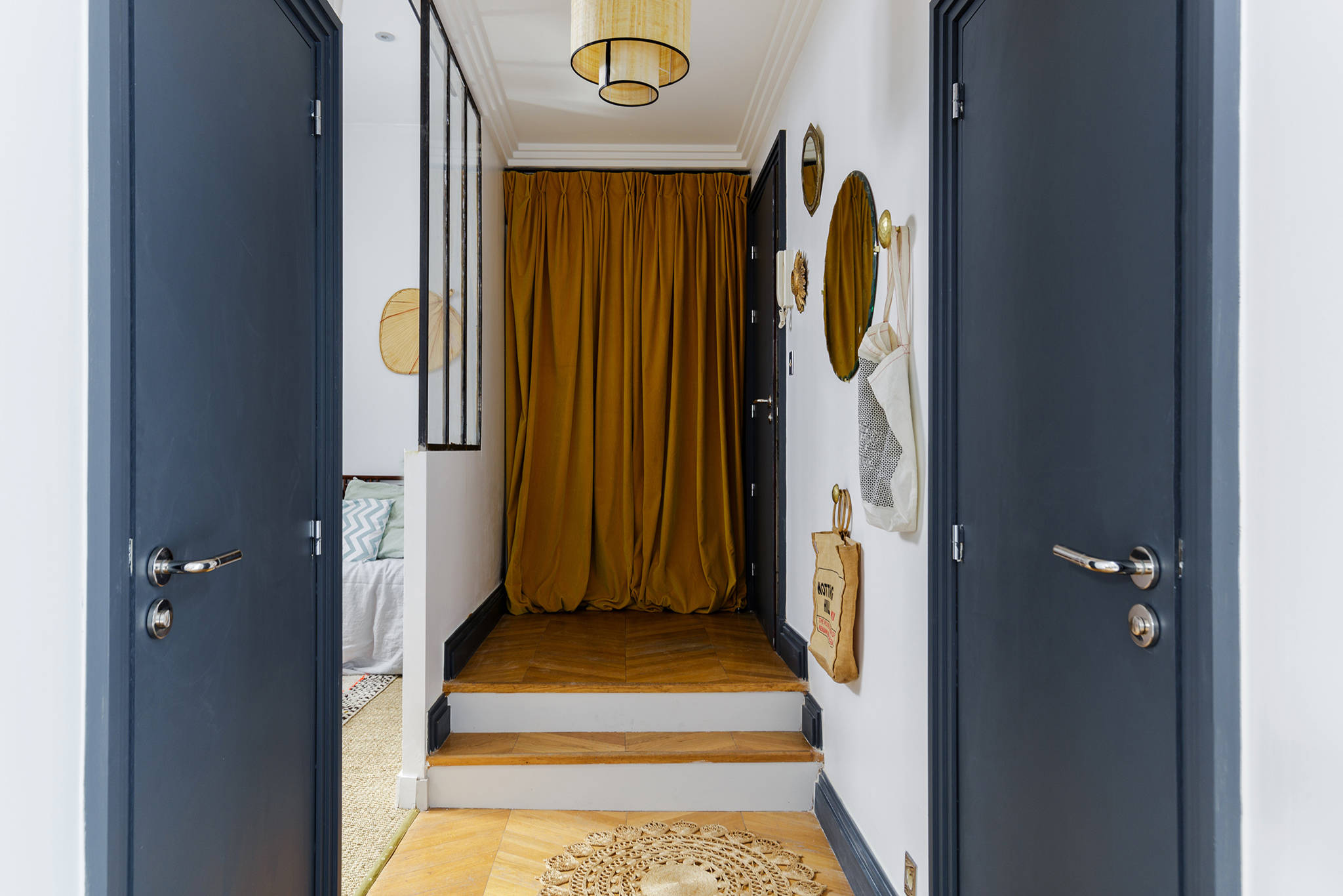 La source principale de froid en hiver, se trouve bien évidemment à l’extérieur et la porte d’entrée, qui marque la liaison entre dedans et dehors se retrouve à ce titre très souvent source de courant d’air. Afin de créer une barrière entre froid et chaud, on s’inspire des pays nordiques qui, lorsque les températures baissent, habillent leur porte d’entrée d’un lourd rideau pour l’isoler.