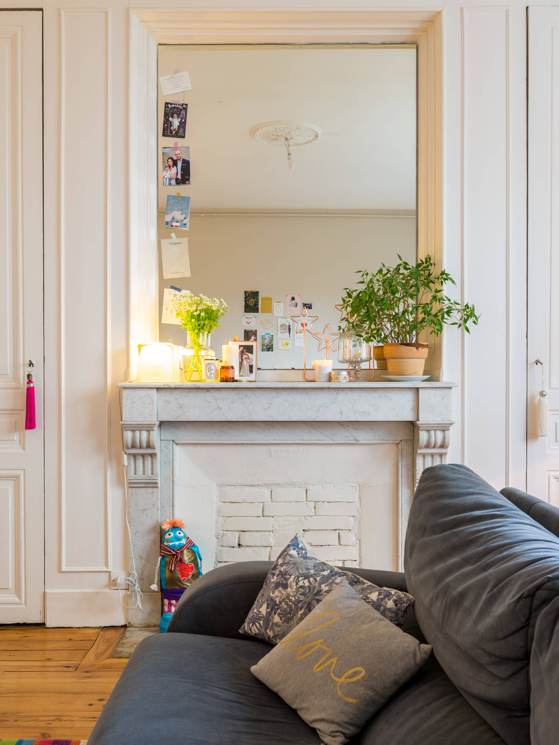 On aime : Le manteau de la cheminée qui a été conservé en l‘état, même si le foyer n’existe plus. Il offre un joli pôle décoratif et beaucoup de charme à ce petit salon lyonnais.
