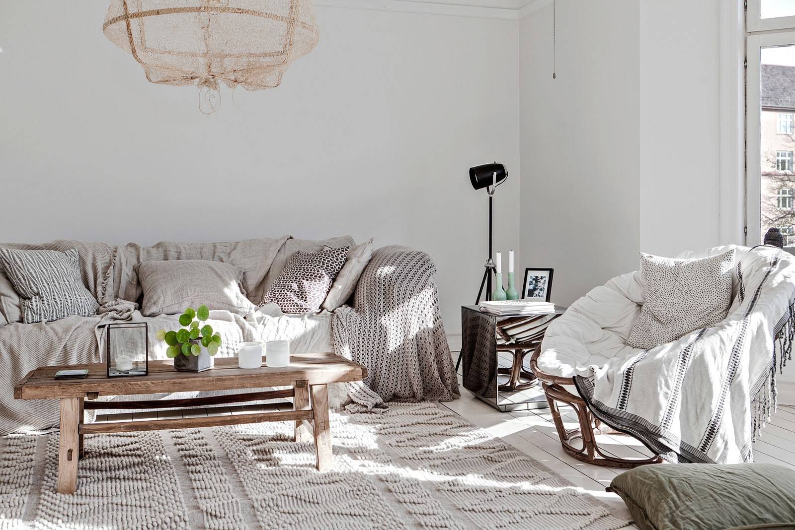 On aime : Les matières naturelles et les tissus épais comme la laine, la maille ou le feutre qui s’adaptent à tous les styles et qui, accumulés dans un intérieur, permettront de faire grimper la température.