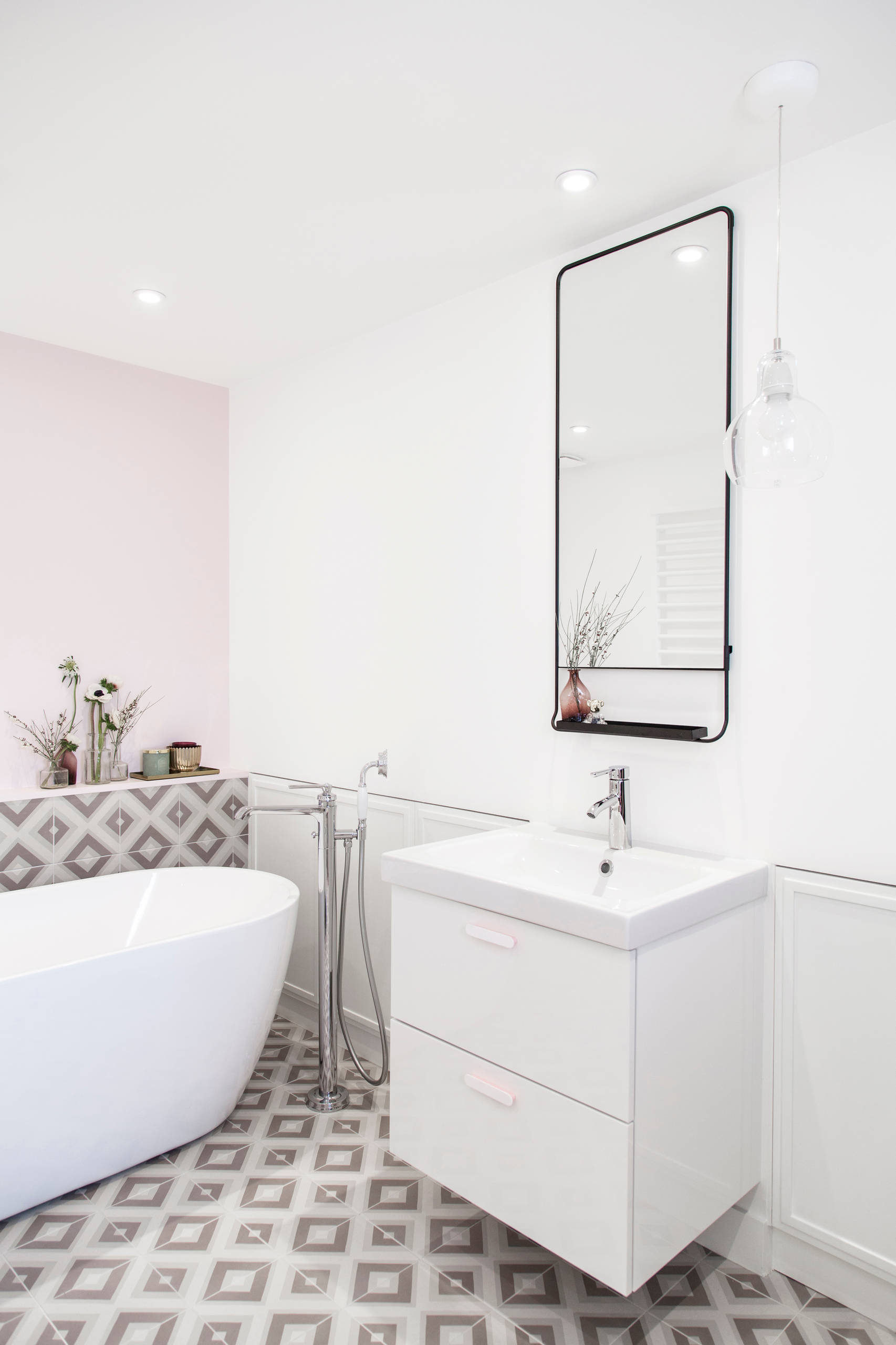 On aime : Que la simplicité ne soit pas synonyme d’uniformité. On en profite donc pour jouer avec de jolis détails, couleurs et matières pour faire sortir la salle de bains du lot.