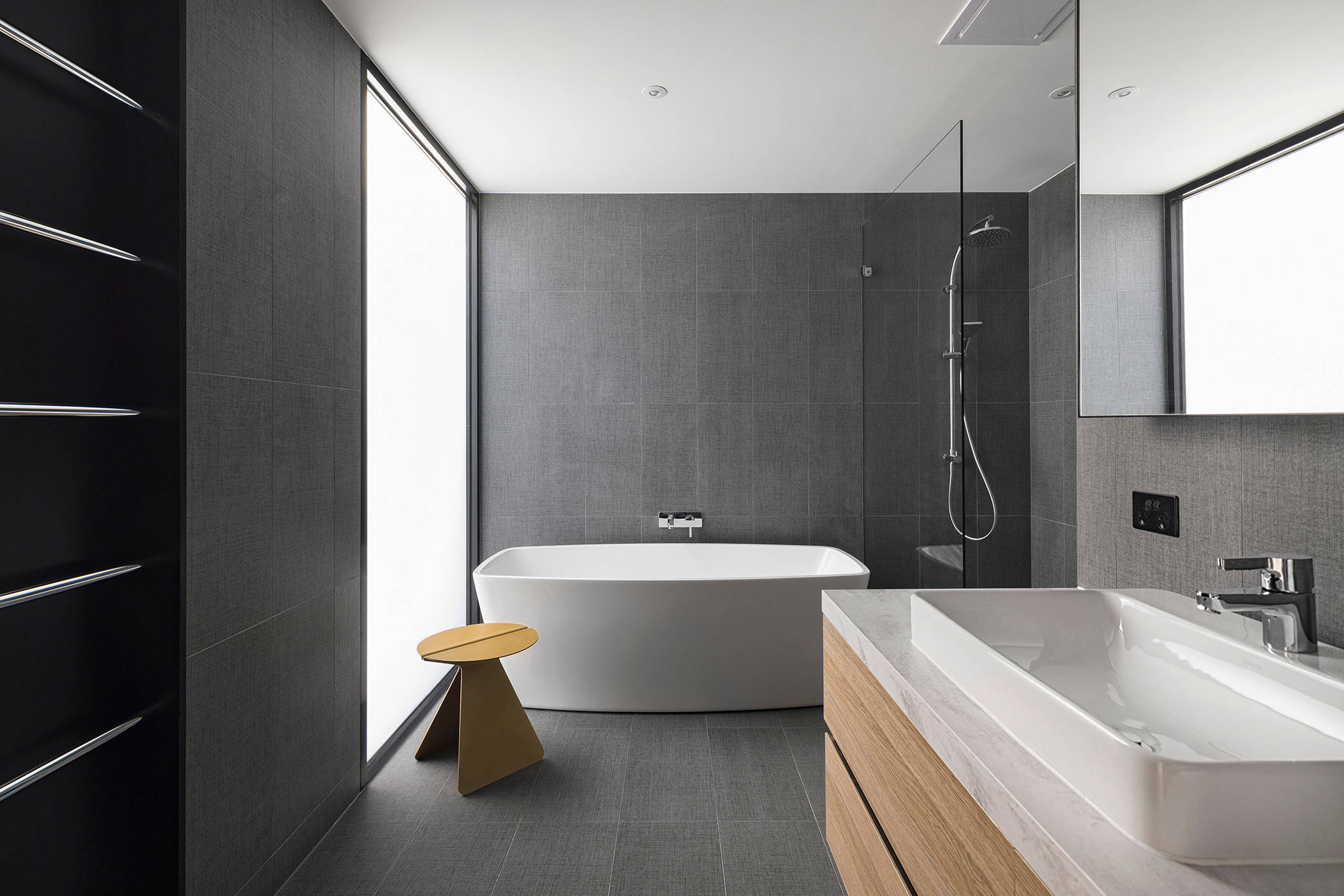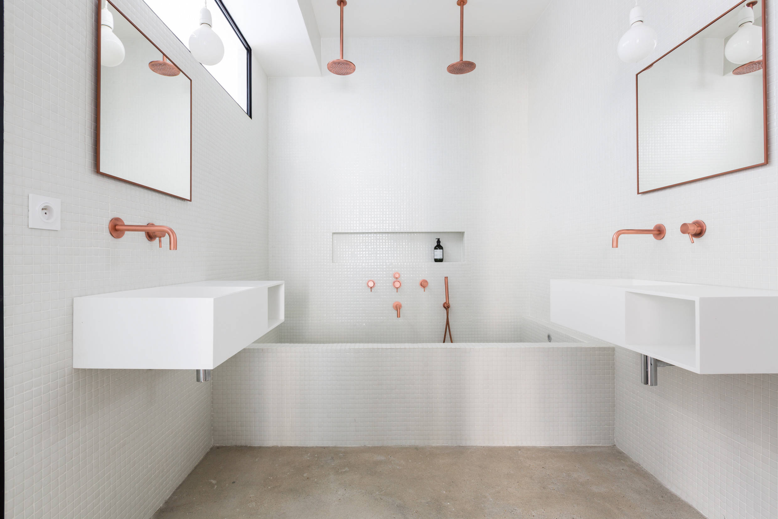 On aime : La stabilité qu’un sol foncé apporte à la pièce. La salle de bains, bien que lieu d’évasion, reste ainsi ancrée dans la réalité.