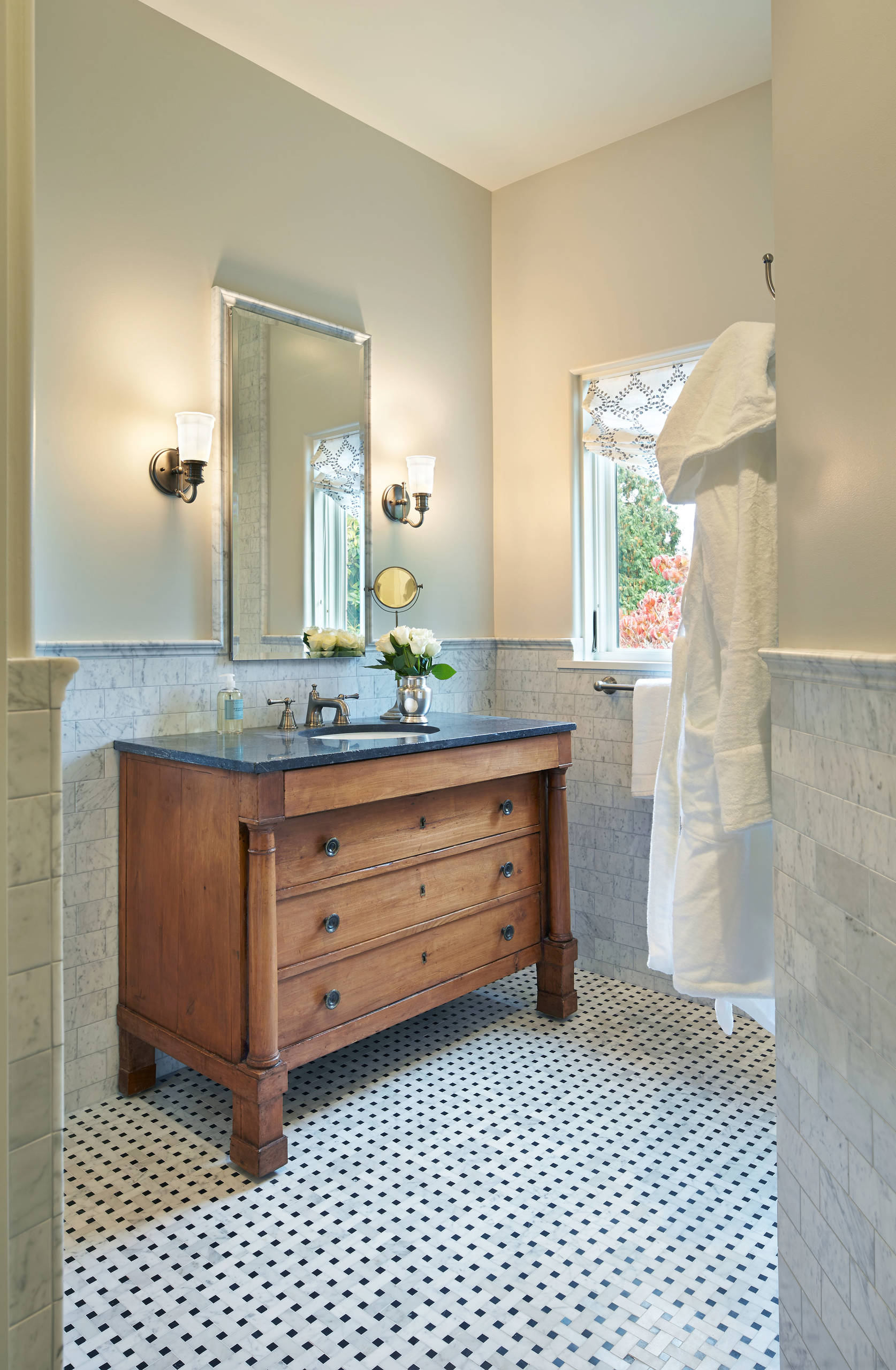 Autre alternative intéressante : installer une commode ancienne dans une salle de bains immaculée, pour y ranger linge éponge et draps fraîchement repassés. Le petit plus ? Les accessoires anciens, miroir et flacons de verre, mis en scène sur le sommet de la commode, comme pour remémorer aux visiteurs le raffinement des habitants de la maison.