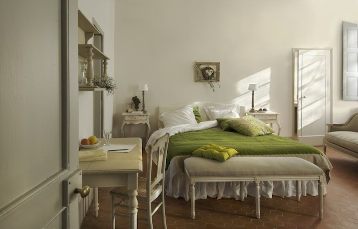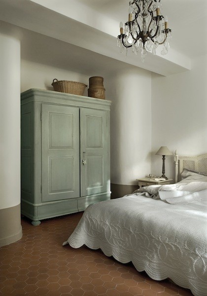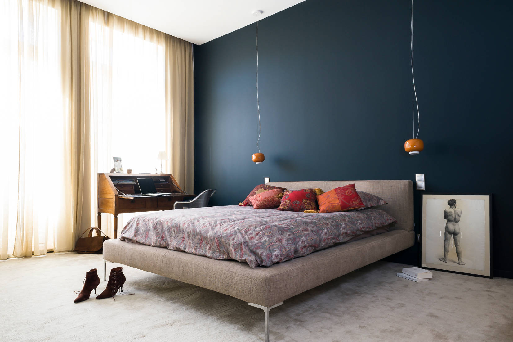 L’astuce la plus simple, bien connue des décorateurs, consiste à confronter styles et époques différentes. Dans le cas présent, ce grand lit design italien est le compagnon idéal d’un bureau dos d’âne, probablement un meuble de famille fort apprécié des propriétaires. Les rideaux sont volontairement épurés (je vous recommande d’éviter les embrasses, trop classiques), et viennent souligner la facture élégante du secrétaire.