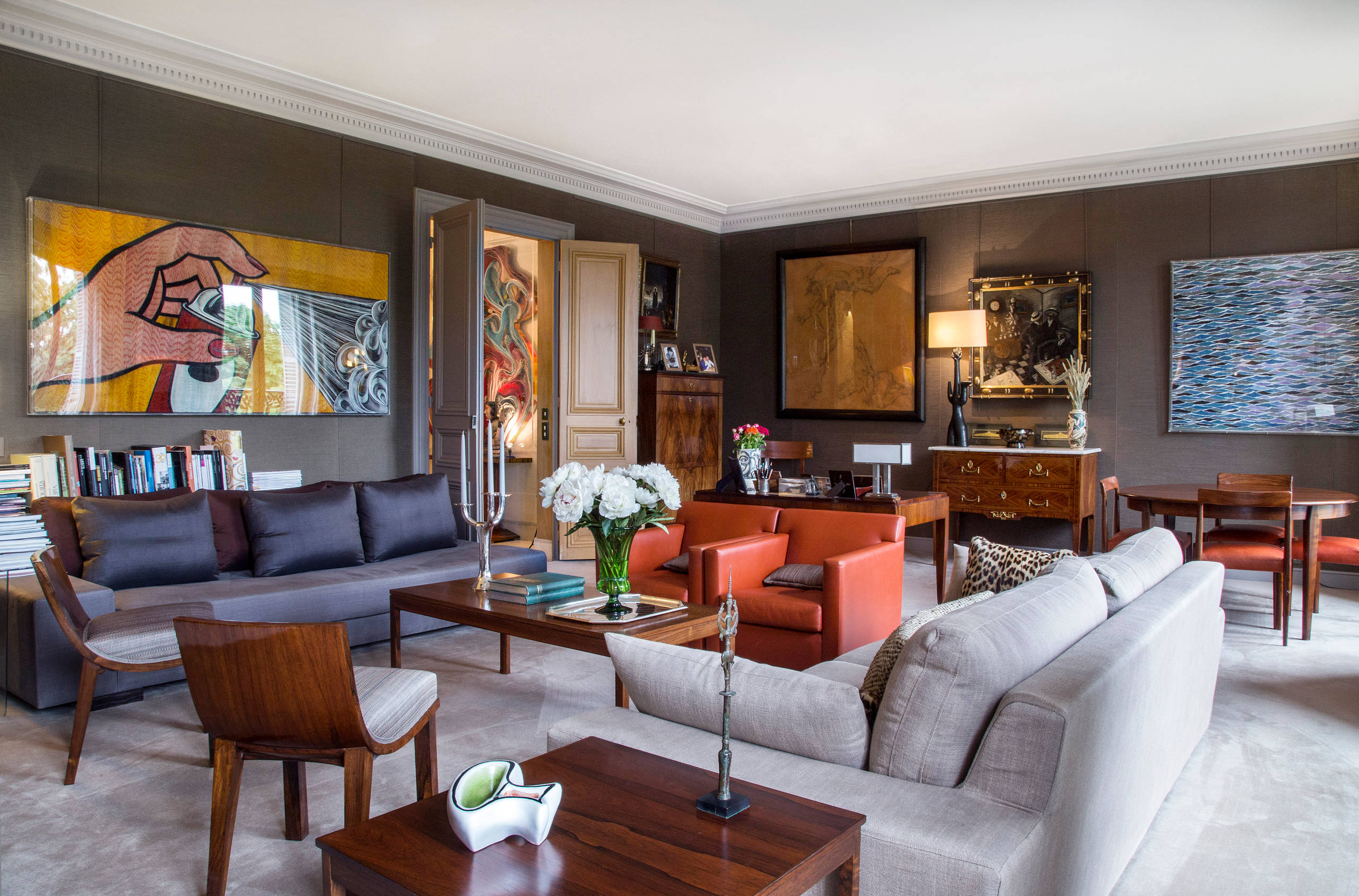 Imaginez ce salon du centre de Paris tout en blanc, sans ses murs taupe et ses audacieux fauteuils orange. L’effet serait diamétralement opposé et ennuyeux. Les meubles anciens sont en effet particulièrement mis en valeur par des teintes sombres, brun, gris, noir et pourquoi pas marine…