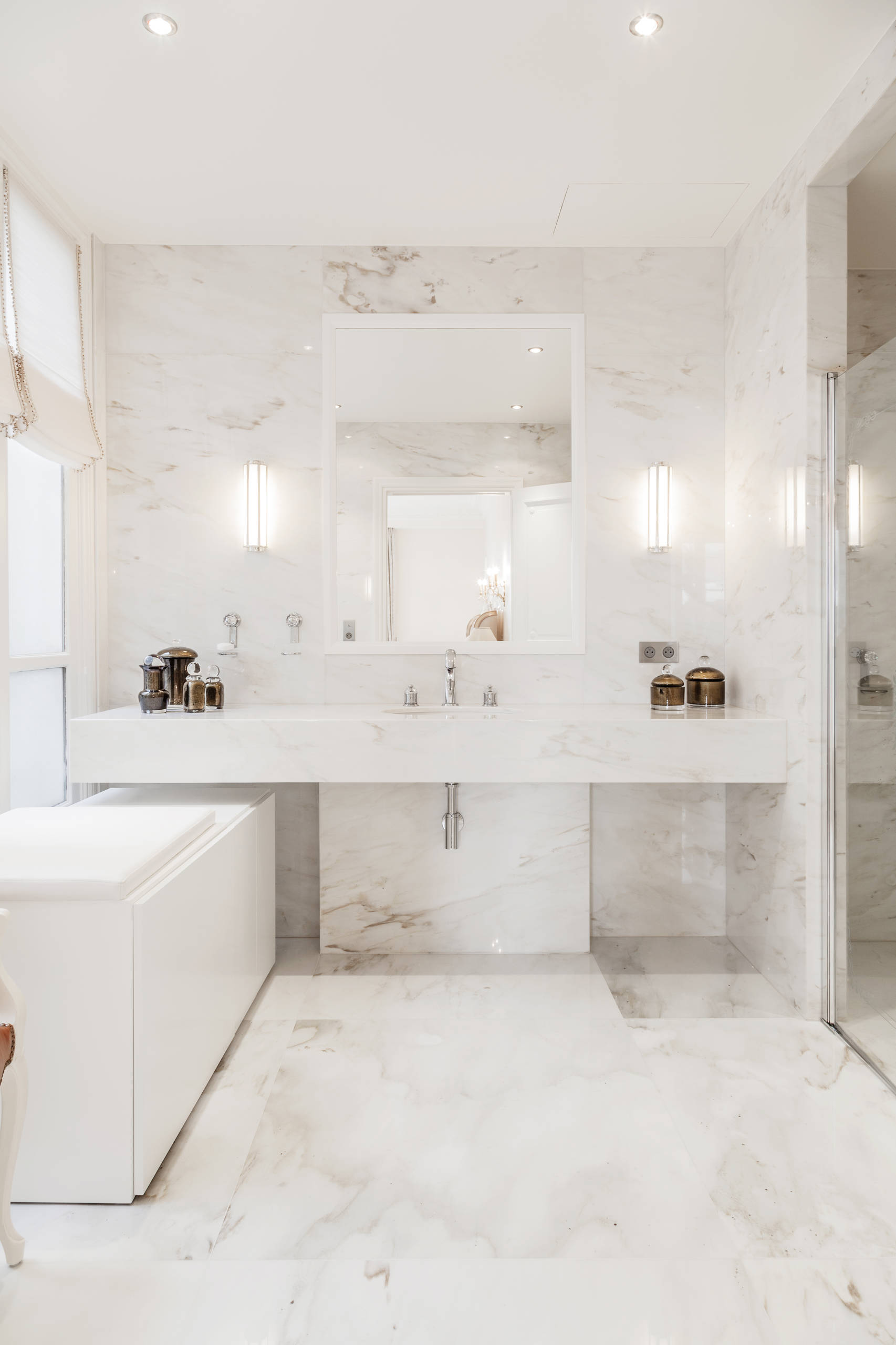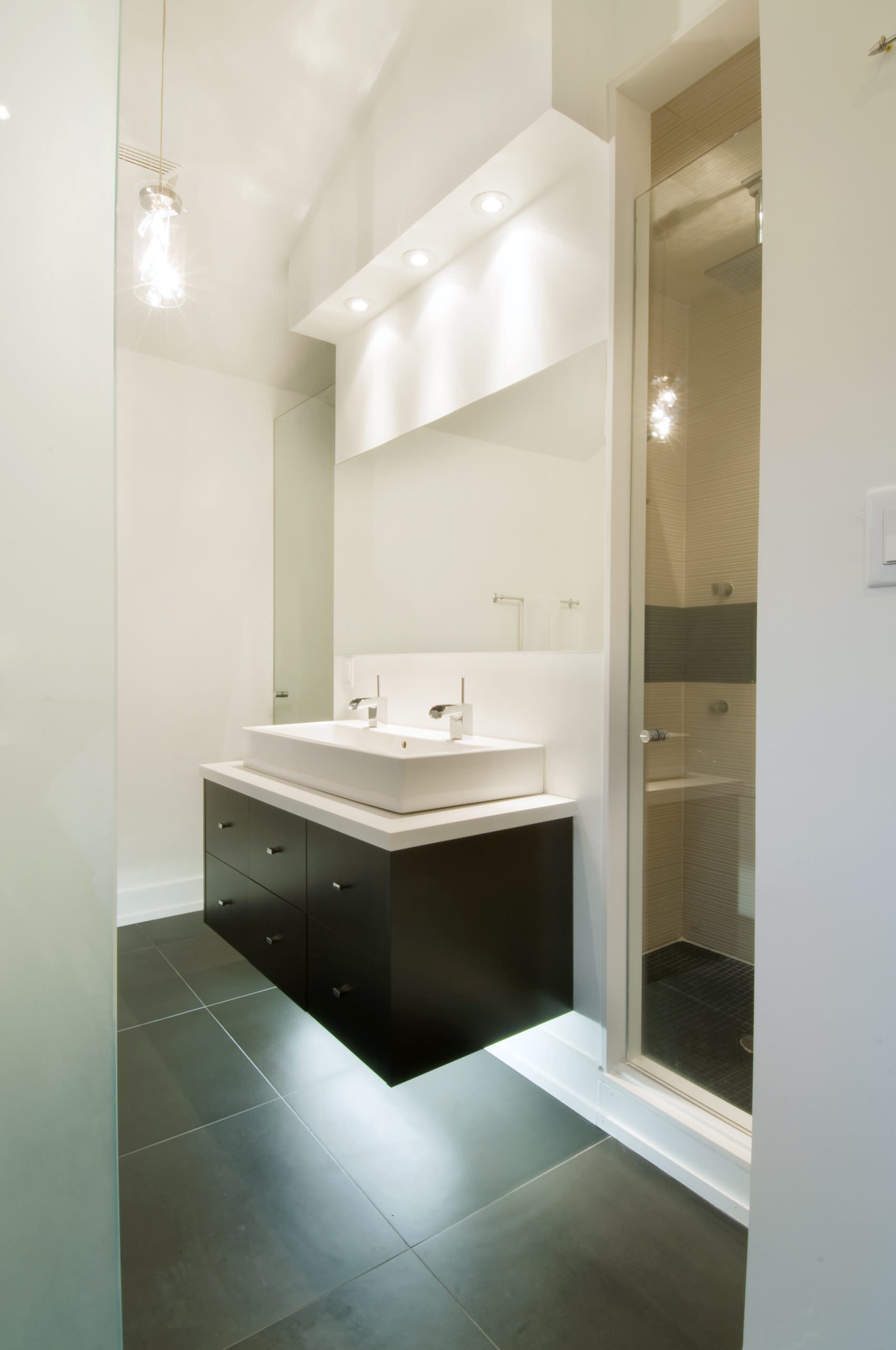 Dans cette salle de bains design d’Atlanta, les spots encadrants le miroir sont dirigés à l’horizontal. Ce croisement de lumière est à la fois flatteur pour le teint et parfait pour l’éclairage fonctionnel !