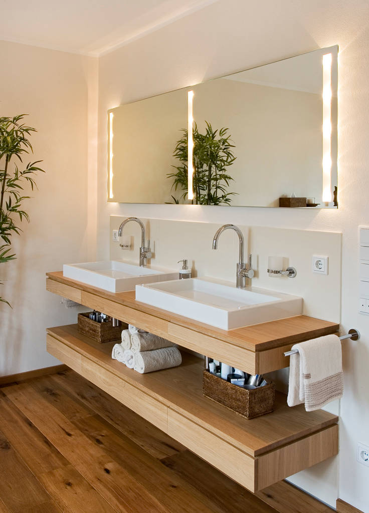 Une salle de bains s’utilise avant que le jour se lève et souvent bien après. Votre pièce ne peut donc pas faire l’impasse sur les deux sources de lumière artificielle indispensables (comme nous l’avons vu en 1).