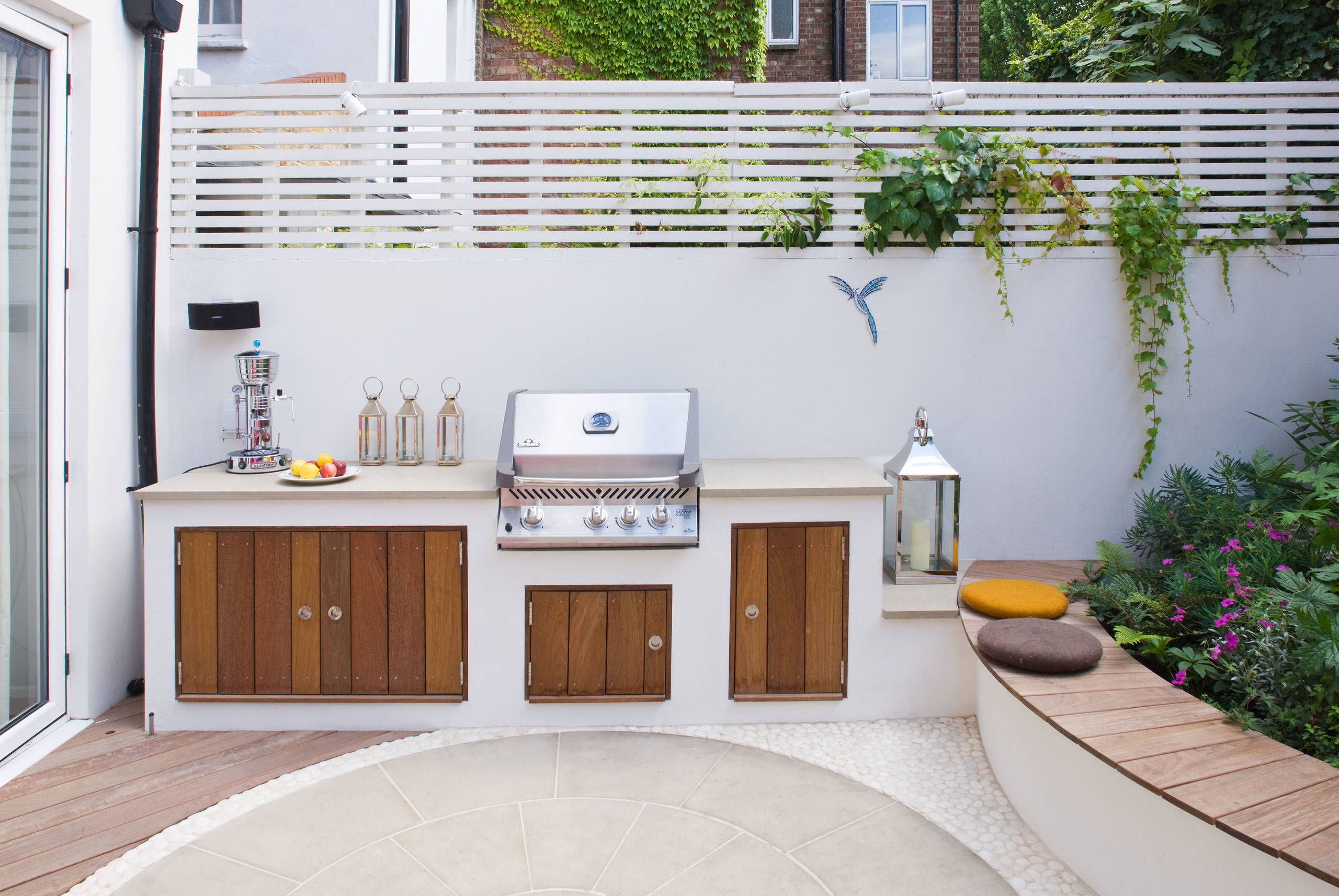 On imagine souvent que le mobilier de jardin doit être rentré l’hiver. Mais ur les grandes terrasses, rien ne vous empêche d’installer du mobilier dit en dur, qui restera en place toute l’année sans s’abîmer. En effet, un brasero ou un barbecue peuvent être des éléments maçonnés et fixes. Ils habillent la terrasse, afin qu’elle ne paraisse pas trop vide une fois la belle saison passée, et servent en hiver sans avoir à les ressortir. Sur ce projet de Germinate Design, par exemple, ils se fondent parfaitement dans le décor.