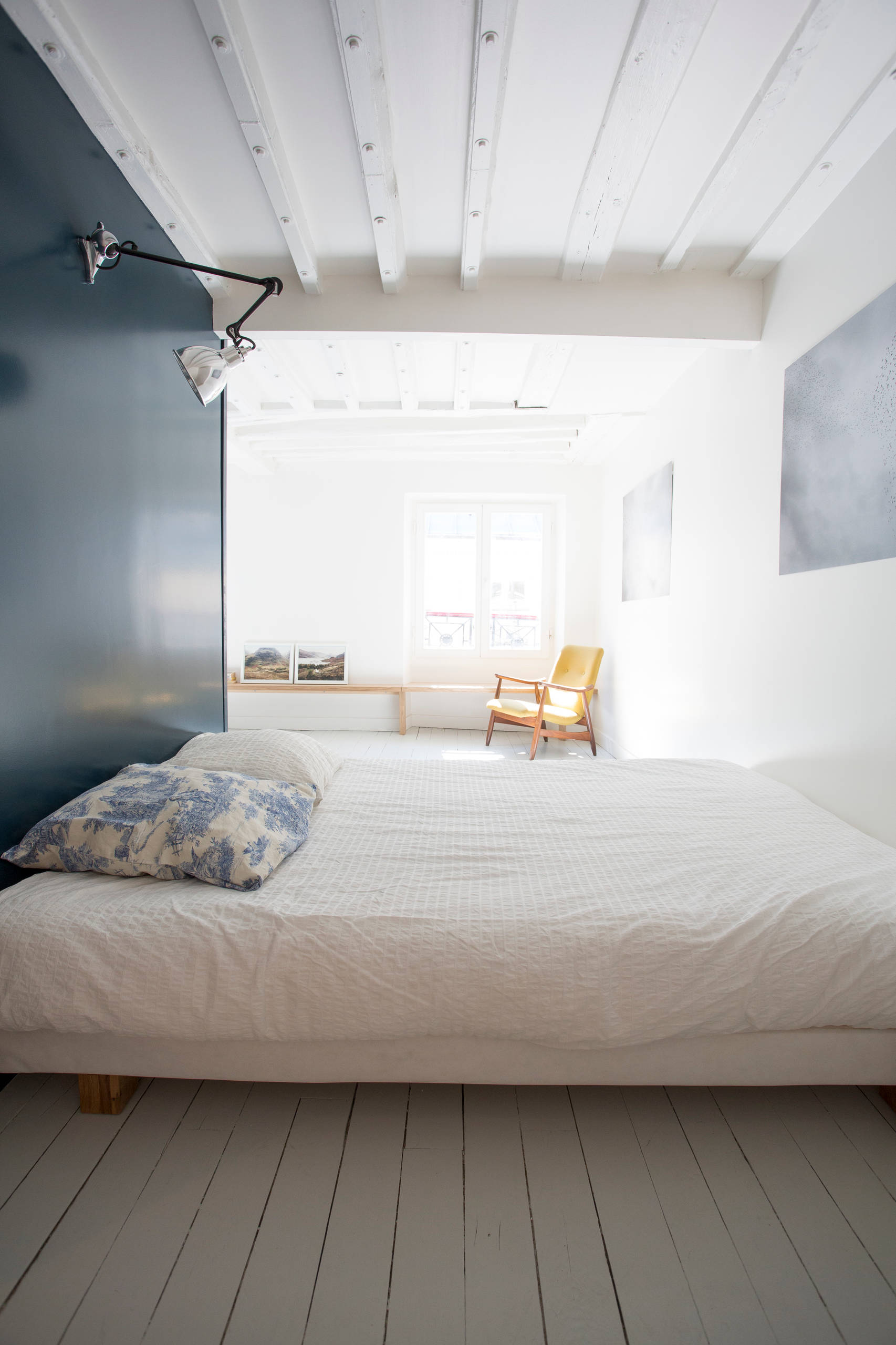 A contrario, n’hésitez pas à poser ponctuellement et de manière très ciblée des pans de couleur. Cette dernière donne une emprise à un espace, ce qui est très pratique pour identifier la cuisine ou la chambre dans les volumes ouverts comme les studios. De plus, un pan de mur peu large peint dans une teinte soutenue permet de créer un effet de profondeur et d’accentuer la perspective. C’est notamment le cas de cet aménagement de studio réussi.