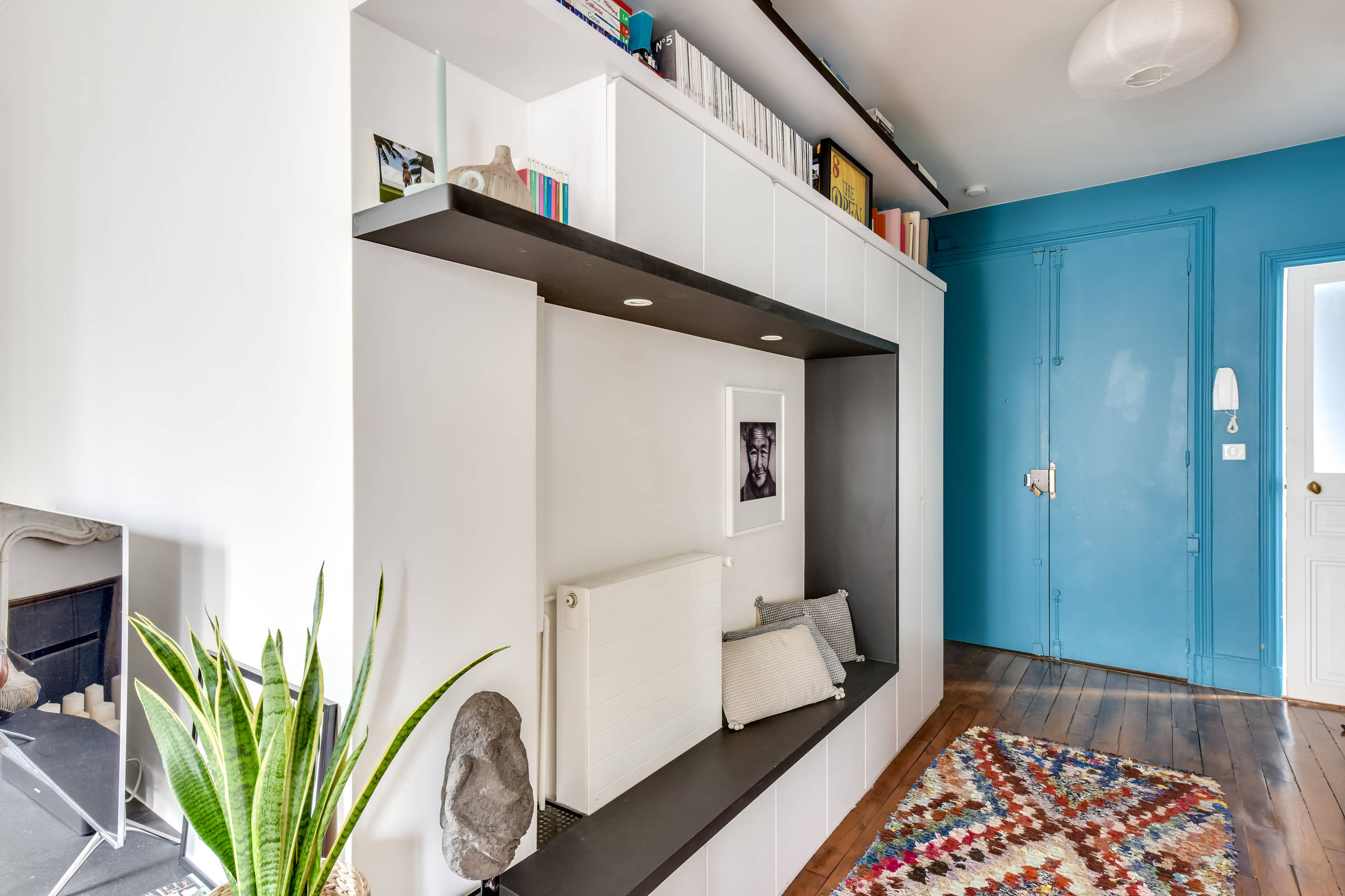 Petit ou grand, l’espace d’une entrée doit être optimisé dans sa globalité. N’hésitez pas à l’investir entièrement pour délester les autres pièces de votre logement. Vous pouvez y installer une penderie, des placards aménagés et même une bibliothèque, qui allégera les salons et chambres en créant des rangements supplémentaires. Occupez sans hésiter toute la hauteur sous plafond puisque l’entrée reste une pièce de passage.