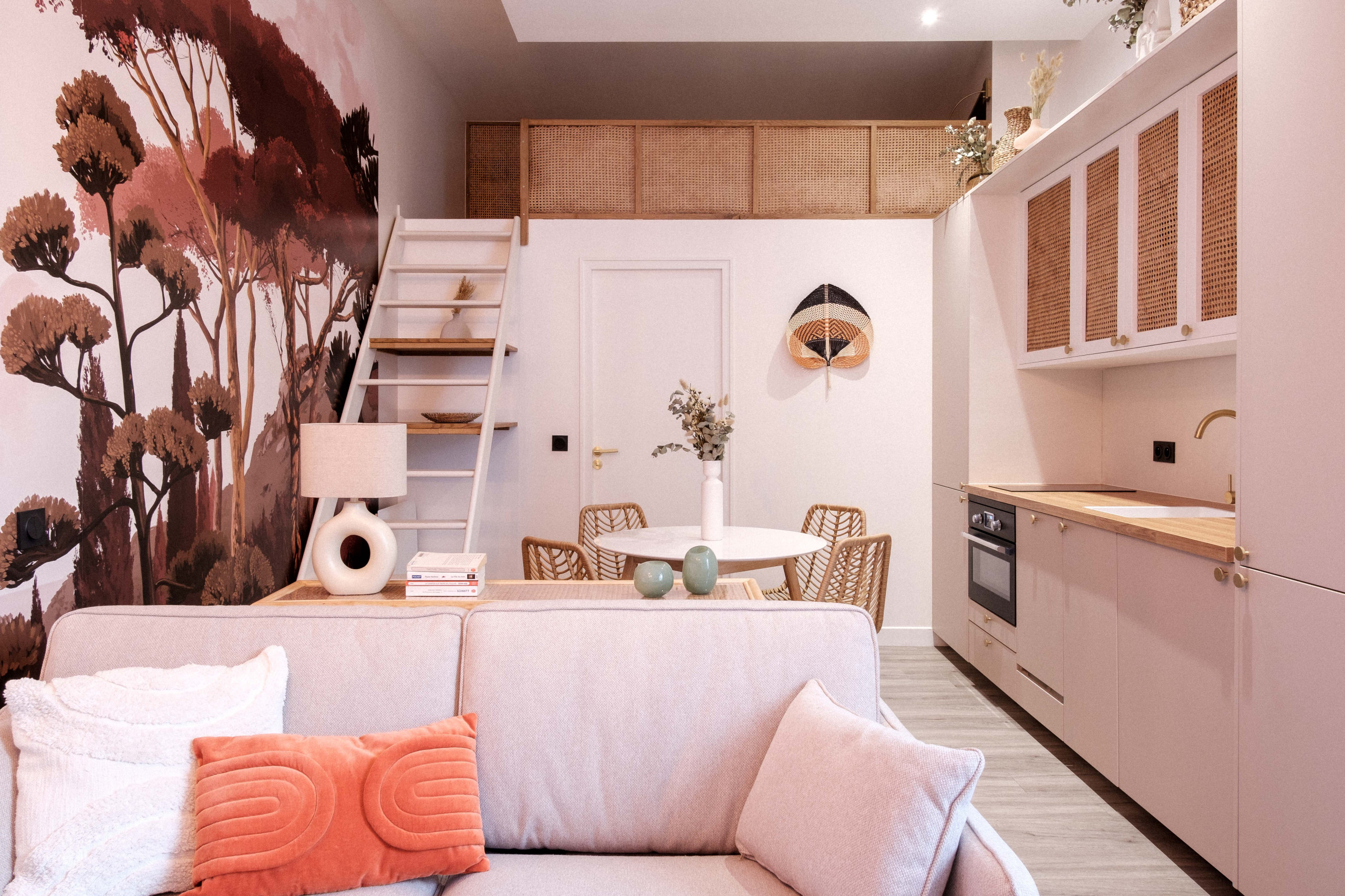 Cette configuration permet de libérer de la place au sol tout en structurant la pièce avec une esthétique épurée et chaleureuse. Sous la mezzanine, un espace multifonctionnel accueille une cuisine compacte, démontrant comment chaque niveau peut être exploité intelligemment. Une vraie leçon de gain d’espace, alliant design et praticité.