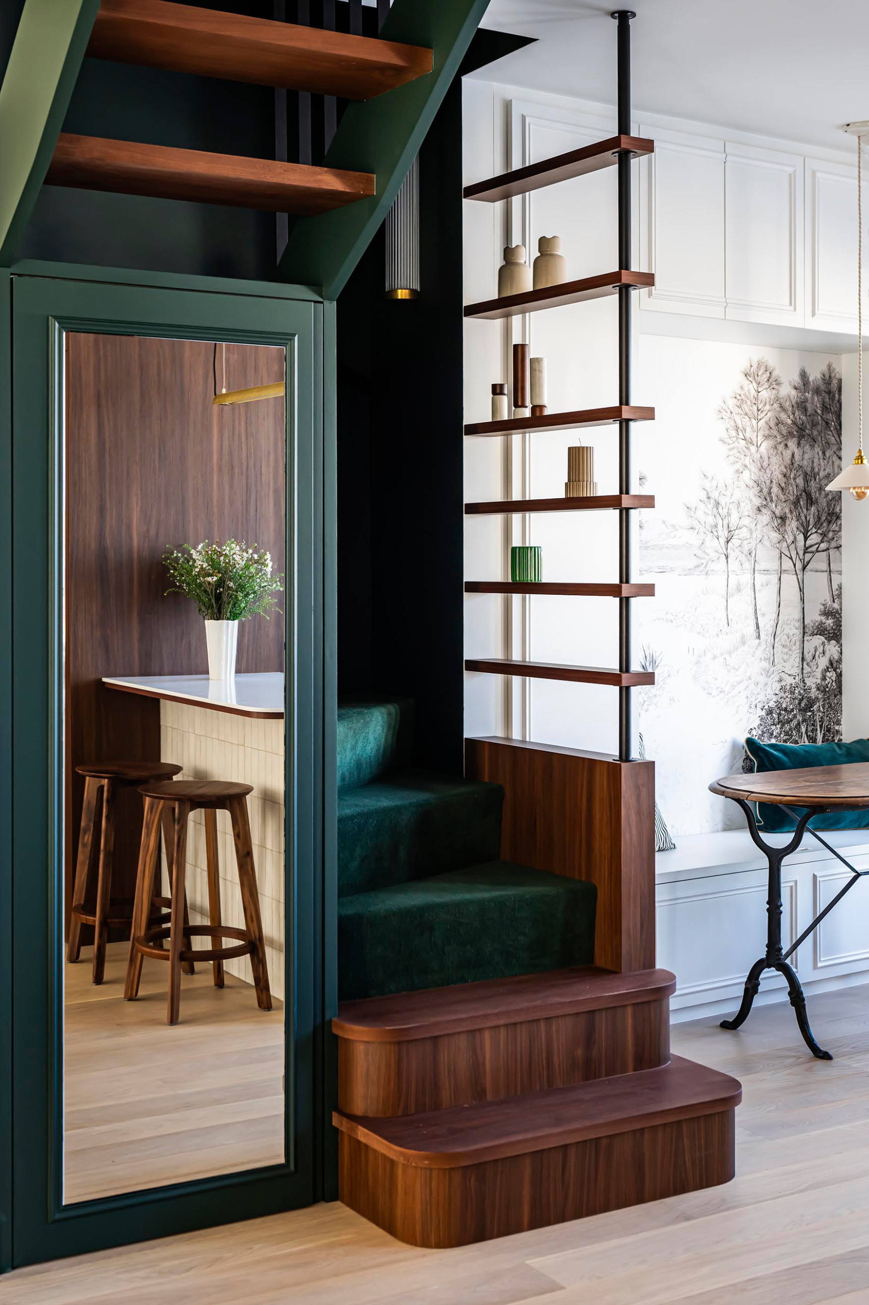 Les marches en bois sombre, alliées à la moquette verte, apportent une touche sobre et élégante, tandis que le miroir, astucieusement placé, dissimule un placard à balais, alliant fonctionnalité et design. Le garde-corps prend la forme d’étagères ouvertes afin d’apporter de la légèreté au design et des rangements pour des objets décoratifs. Cet escalier est un exemple parfait d’optimisation élégante pour les petits espaces, alliant design et ingéniosité.