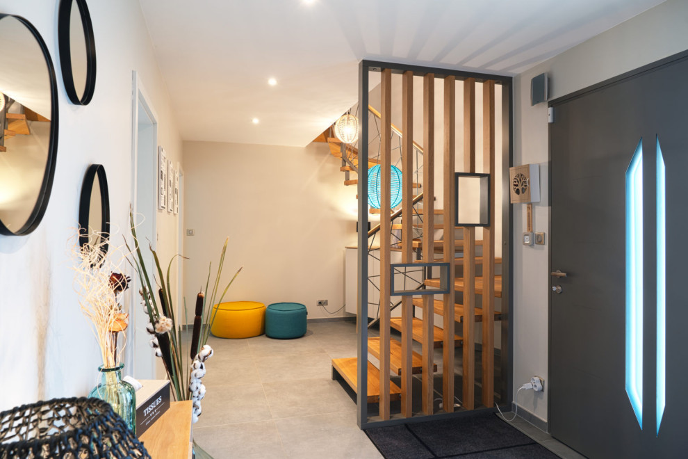 Ici, les lames de bois verticales, combinées à des ouvertures graphiques en métal, créent une cloison élégante tout en laissant passer la lumière. Cet élément structurel permet de dissimuler l’escalier et définit subtilement les espaces. Associé aux tons naturels et aux touches colorées des poufs, ce design allie fonctionnalité et esthétisme, offrant une entrée accueillante et harmonieuse.