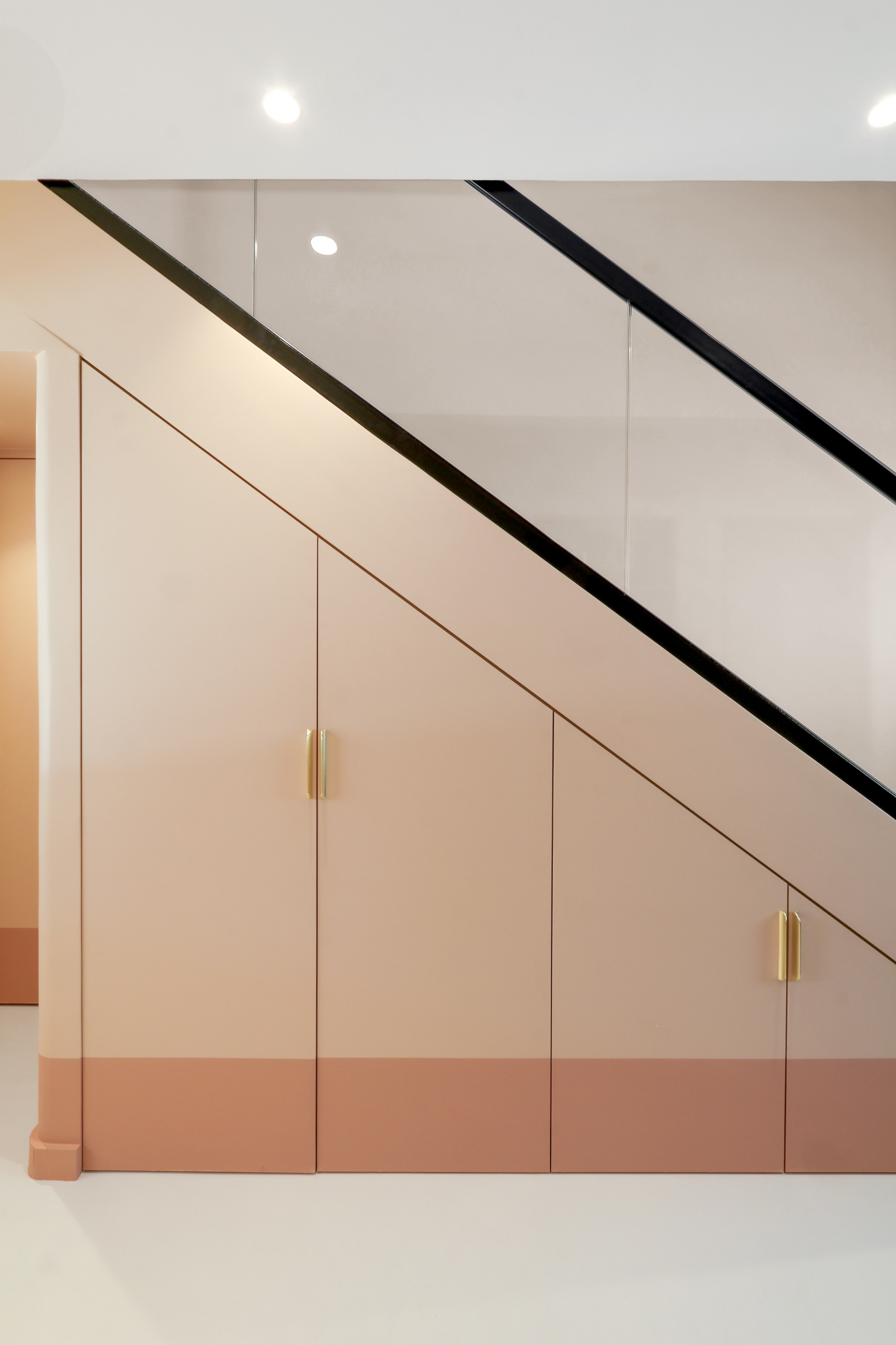Le Studio Menthe à l’Eau a transformé l’espace sous l’escalier en un rangement ingénieux et élégant. Ces placards sur mesure optimisent chaque centimètre, alliant design et rangements.
