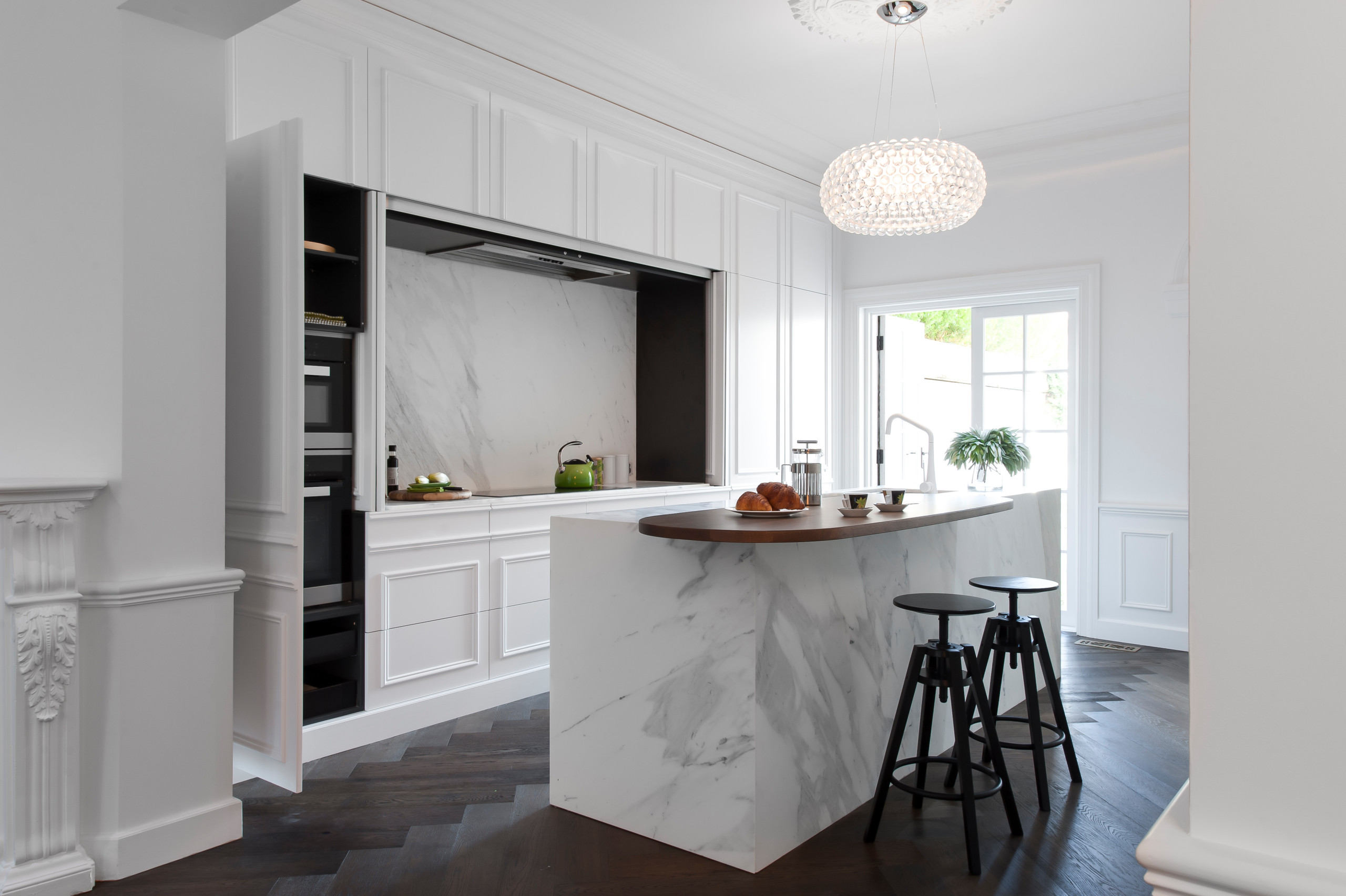 Sur le même principe, cette cuisine avec îlot central australienne des plus classiques se soustrait elle aussi à la vue une fois les placards refermés.