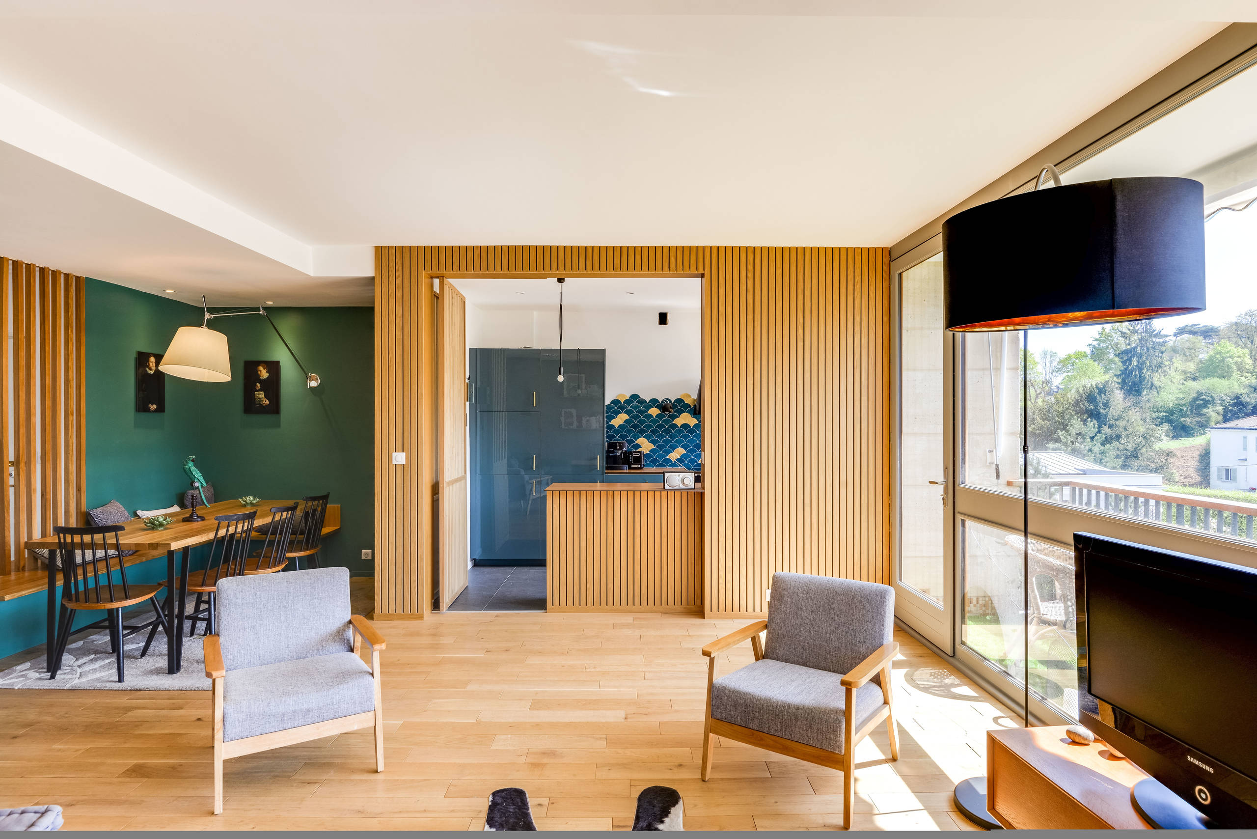 On aime : Le joli volume ainsi créé, qui devient l’atout principal de la pièce à vivre. Il laisse deviner une certaine activité, mais permet en même temps de préserver une certaine magie.