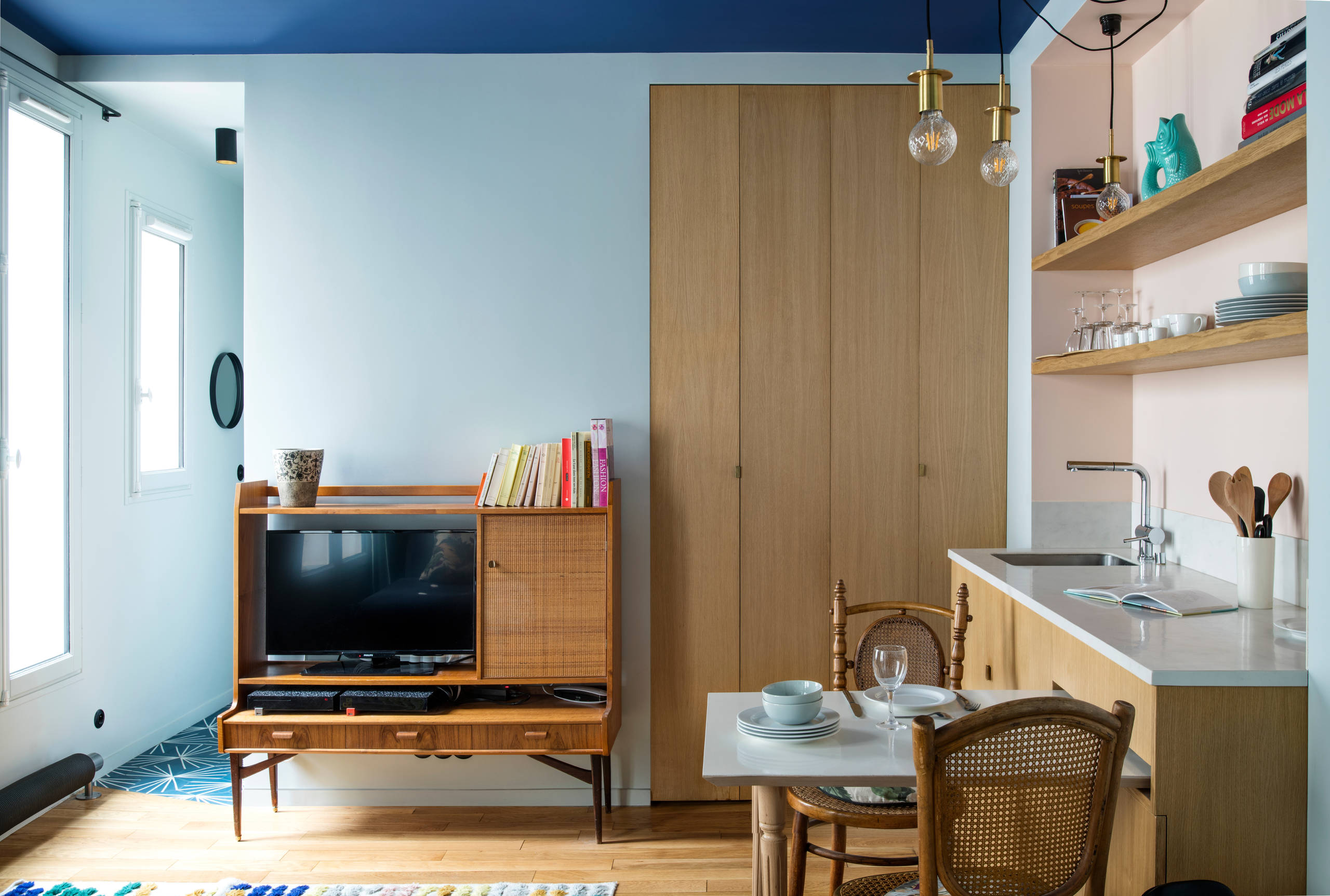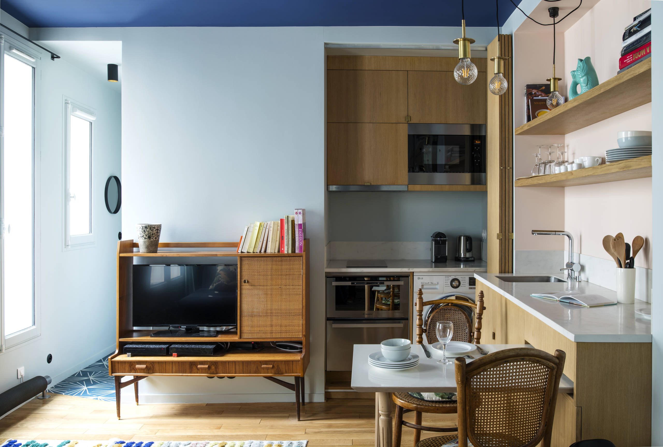 Dans les tout petits espaces, fermer la cuisine en fin de repas pour permettre au salon de retrouver son identité est une priorité. Il faudra souvent faire preuve de beaucoup d’imagination pour que l’espace soit optimisé sans qu’aucune des fonctions ne soit dénaturée. Dans la cuisine sur mesure de ce mini-appartement, un simple décrochement dans le mur devient un coin cuisson astucieux qui, grâce à un jeu de portes en accordéon, devient placard à part entière lorsque l’on n’en a plus besoin.