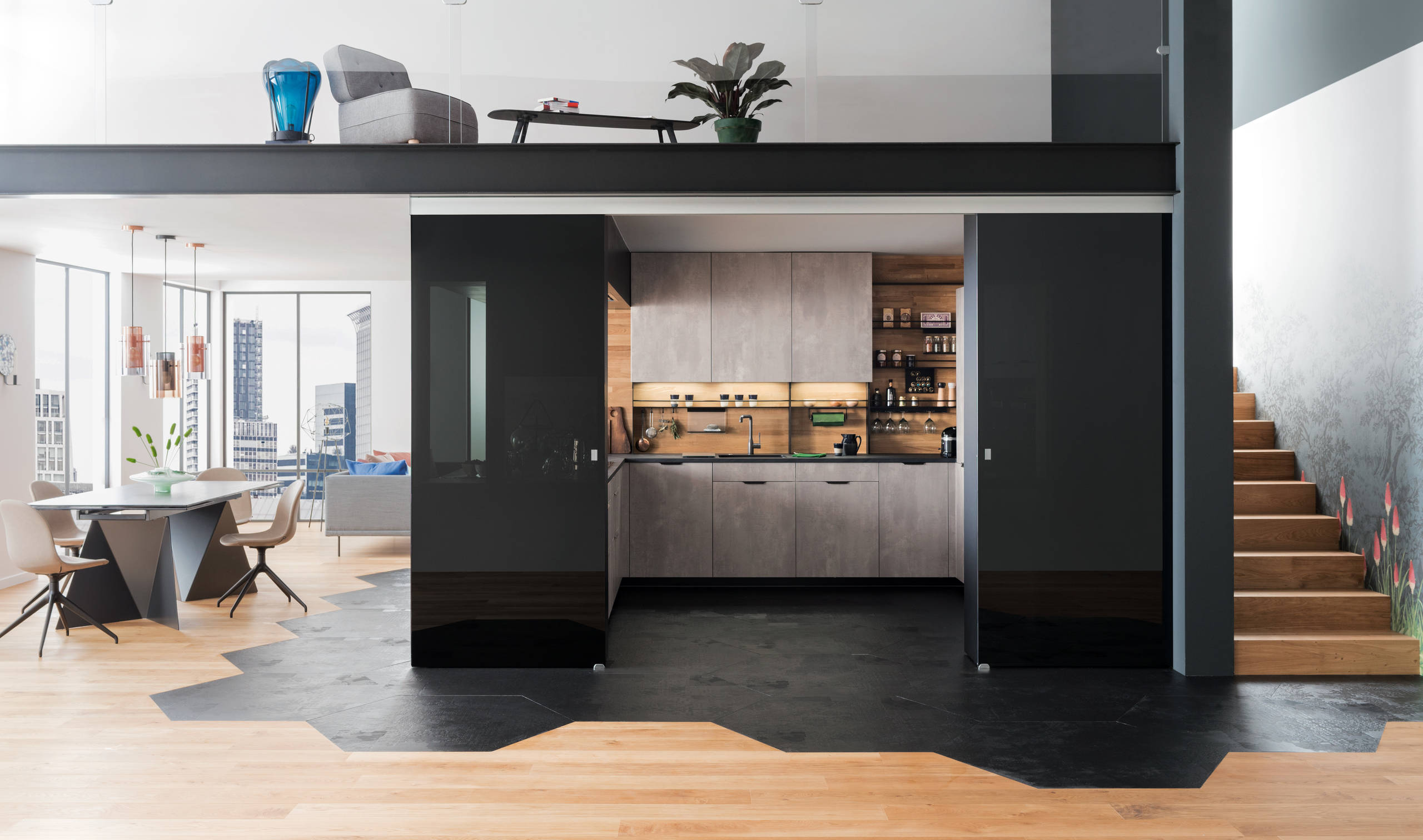 Sur le même principe, dans cette cuisine lyonnaise, de grandes portes coulissante en verre fumé viennent fermer l’espace à la demande. Sol foncé et façade ne font plus qu’un et transforment ainsi la perception de l’espace.