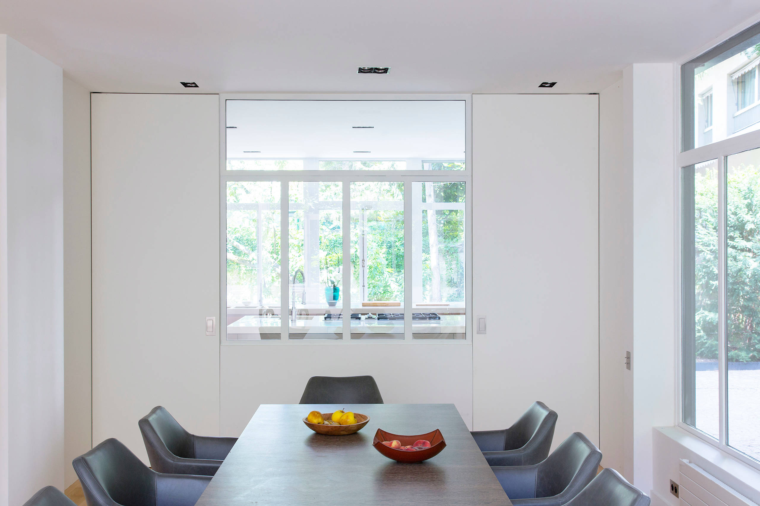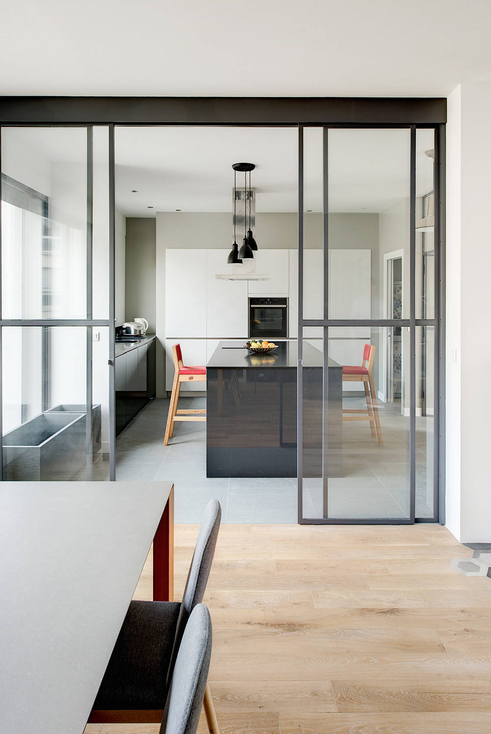 On aime : Le traitement tout en transparence et sur toute la hauteur de ces portes atypiques. Il efface de manière spectaculaire les limites entre cuisine et salle à manger.