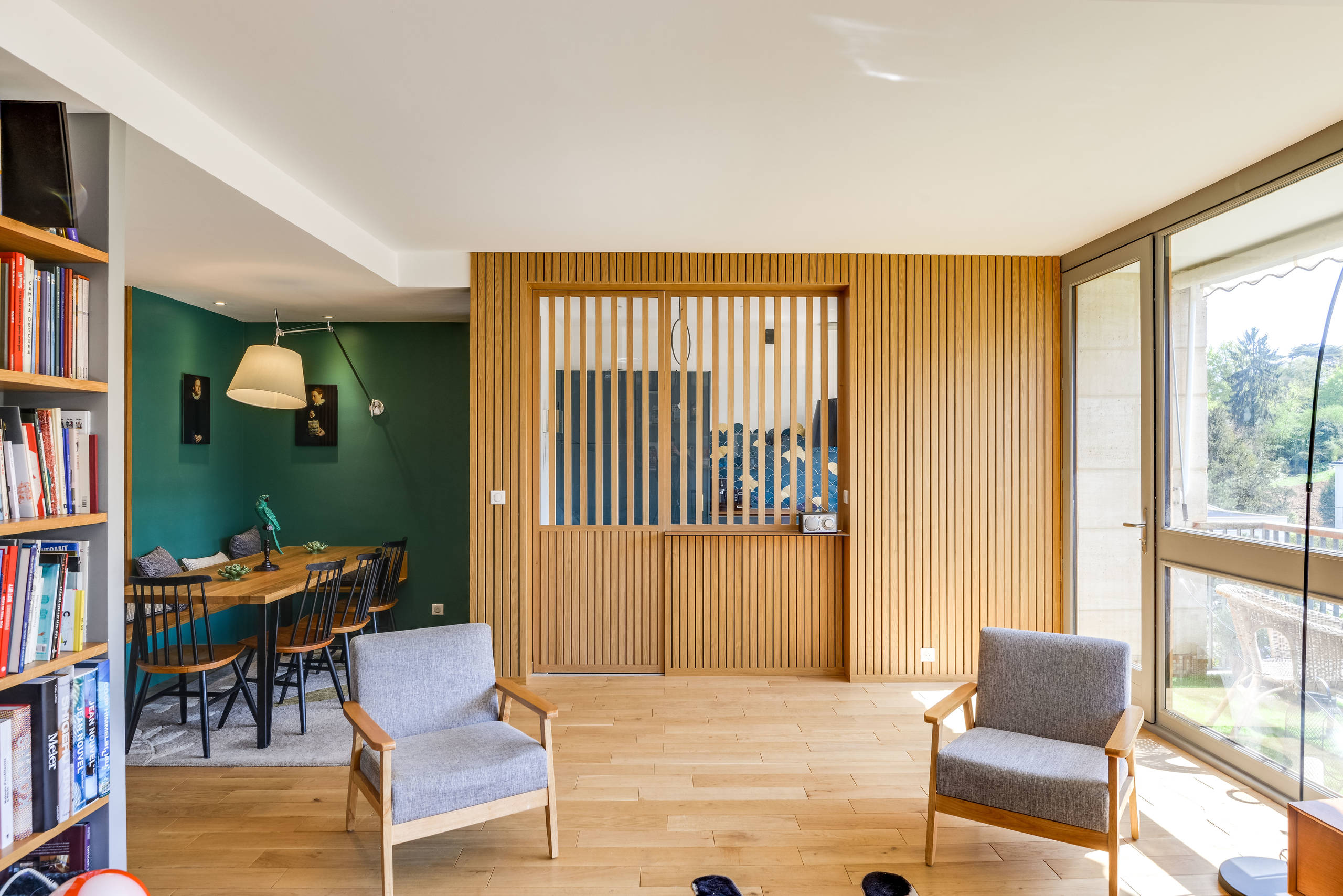 Voir sans être vu, c’est tout le principe du claustra en extérieur. Détourné en paroi intérieure, il crée une jolie surprise, comme dans cette pièce à vivre parisienne. En effet, il offre à deviner la cuisine de manière simple et néanmoins graphique, tout en la cloisonnant.