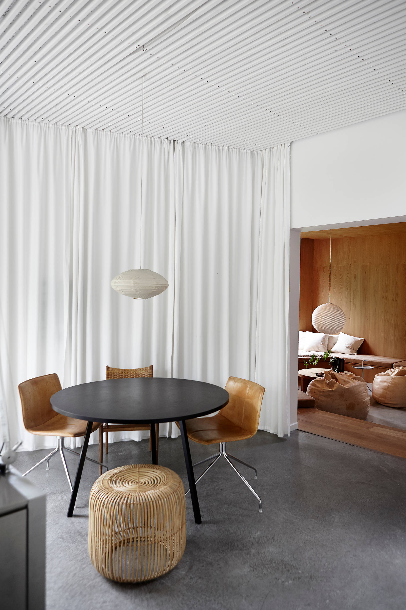 Pour arriver à l’esthétisme si particulier du style Japandi, il faut avant tout bien cibler ses besoins. On évite ainsi d’encombrer l’espace de meubles inutiles en ne mettant l’accent que sur les éléments d’aménagement indispensables. On s’inspire si besoin de cette salle à manger américaine, où seule la table et les chaises habitent l’espace.