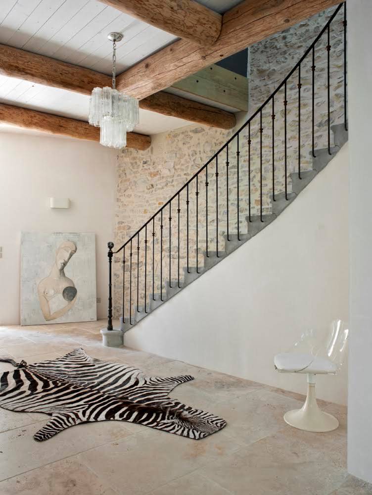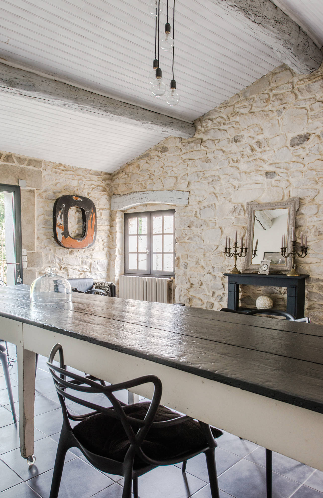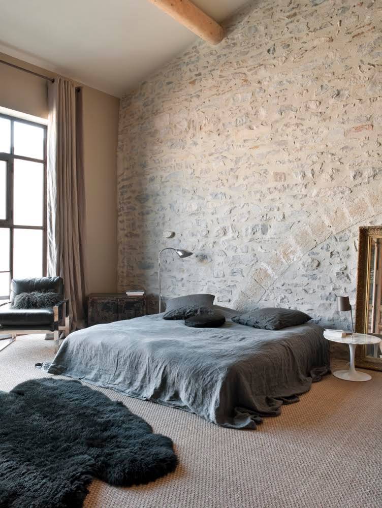 On aime : Le contraste des matières et textures qui mettent en valeur le très joli mur en pierre.