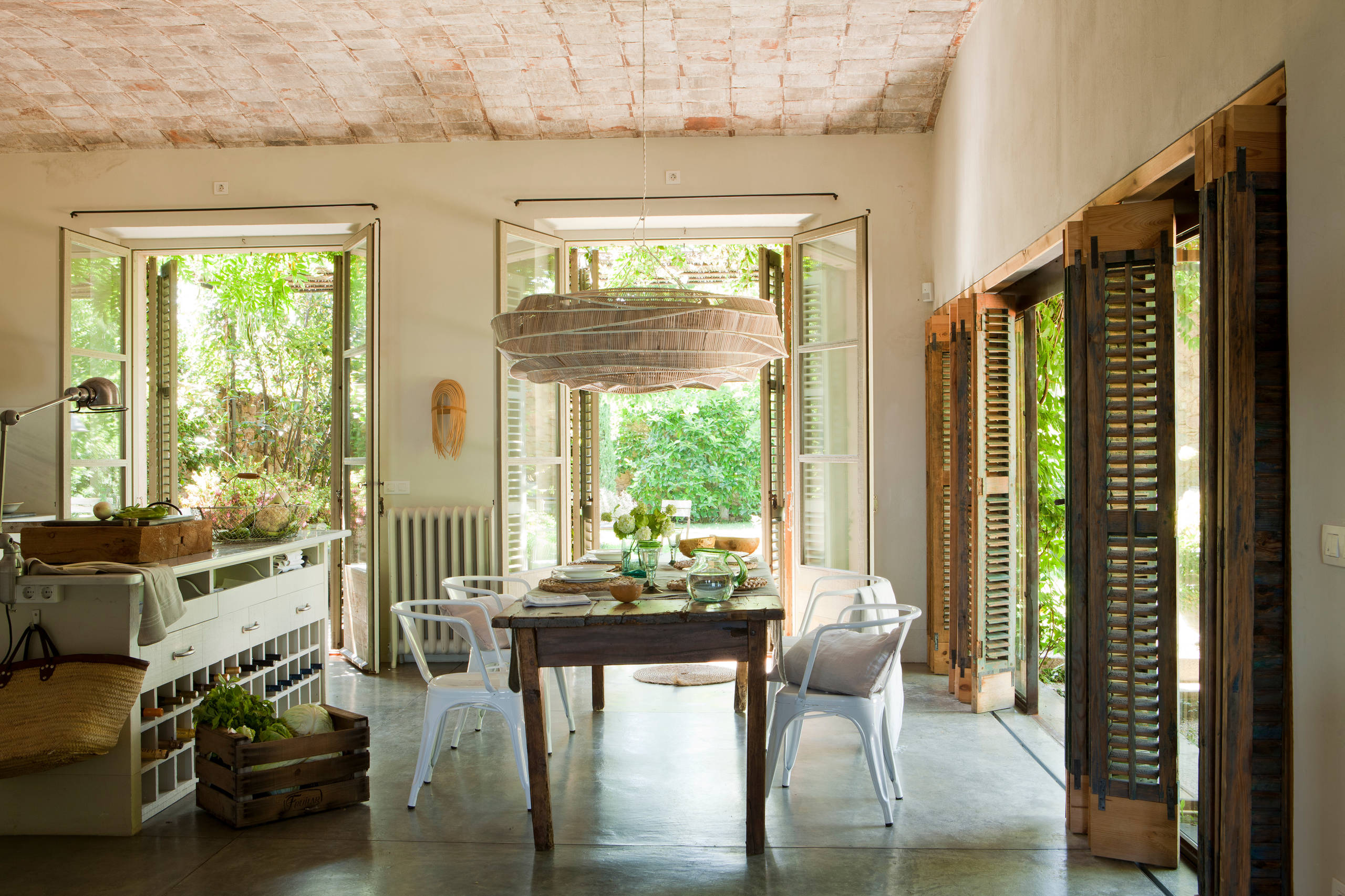 Simplicité et tradition sont de mise lorsque l’on développe une ambiance rurale. Si les matériaux naturels tel que le bois et la pierre, mais aussi les meubles faits artisanalement, trouvent indéniablement leur place dans ce type d’intérieur, il peut être bon d’apporter une petite touche industrielle pour moderniser le tout ! En intégrant, comme dans cette salle à manger, des fauteuils en métal Tolix produits en série, on a rajeuni de manière simple et efficace l’espace.