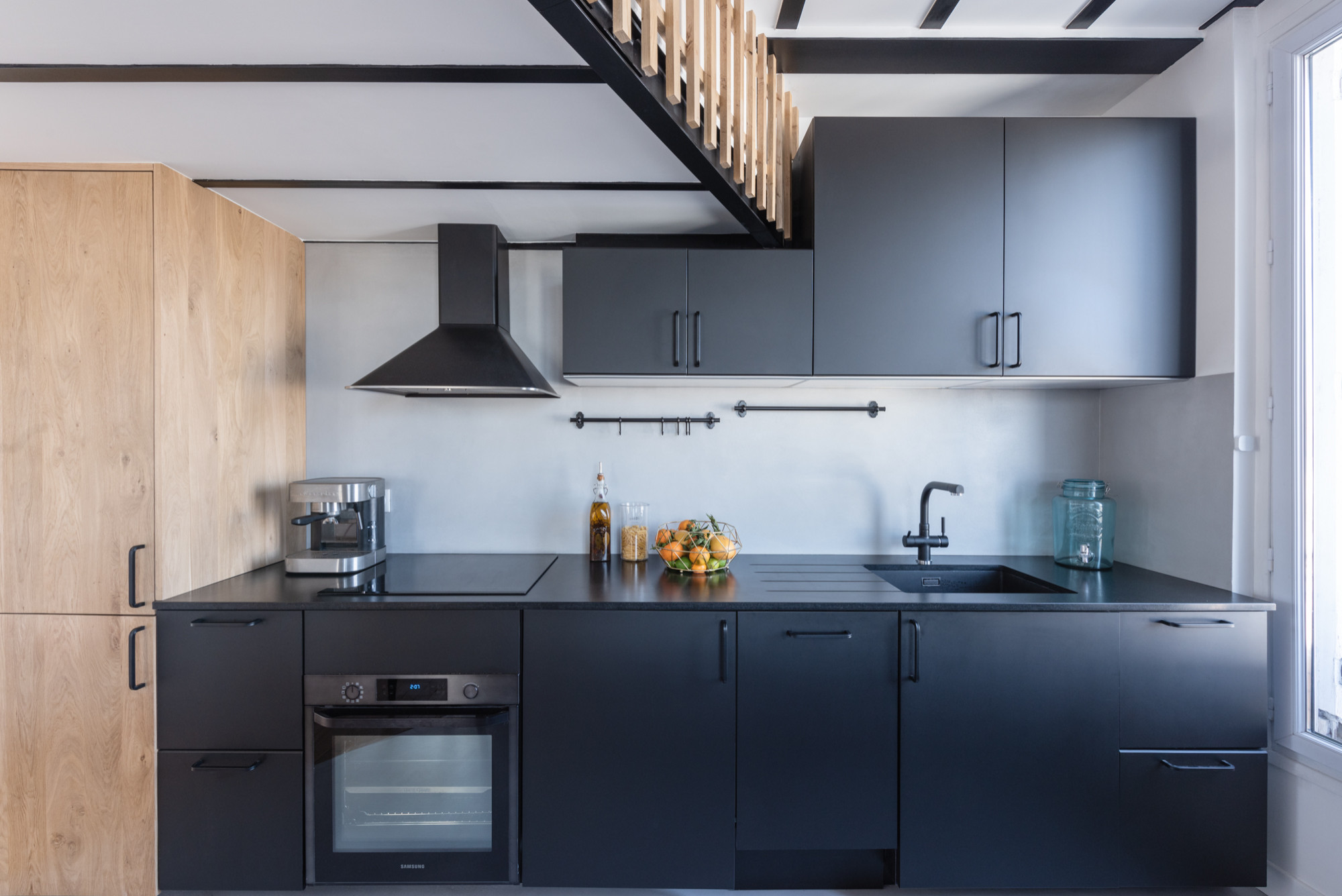 On aime : le module de cuisine en chêne clair qui contraste avec les façades noires.