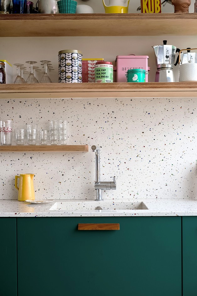 Résolument tendance, le terrazzo égaye l’espace cuisine de son effet moucheté graphique.