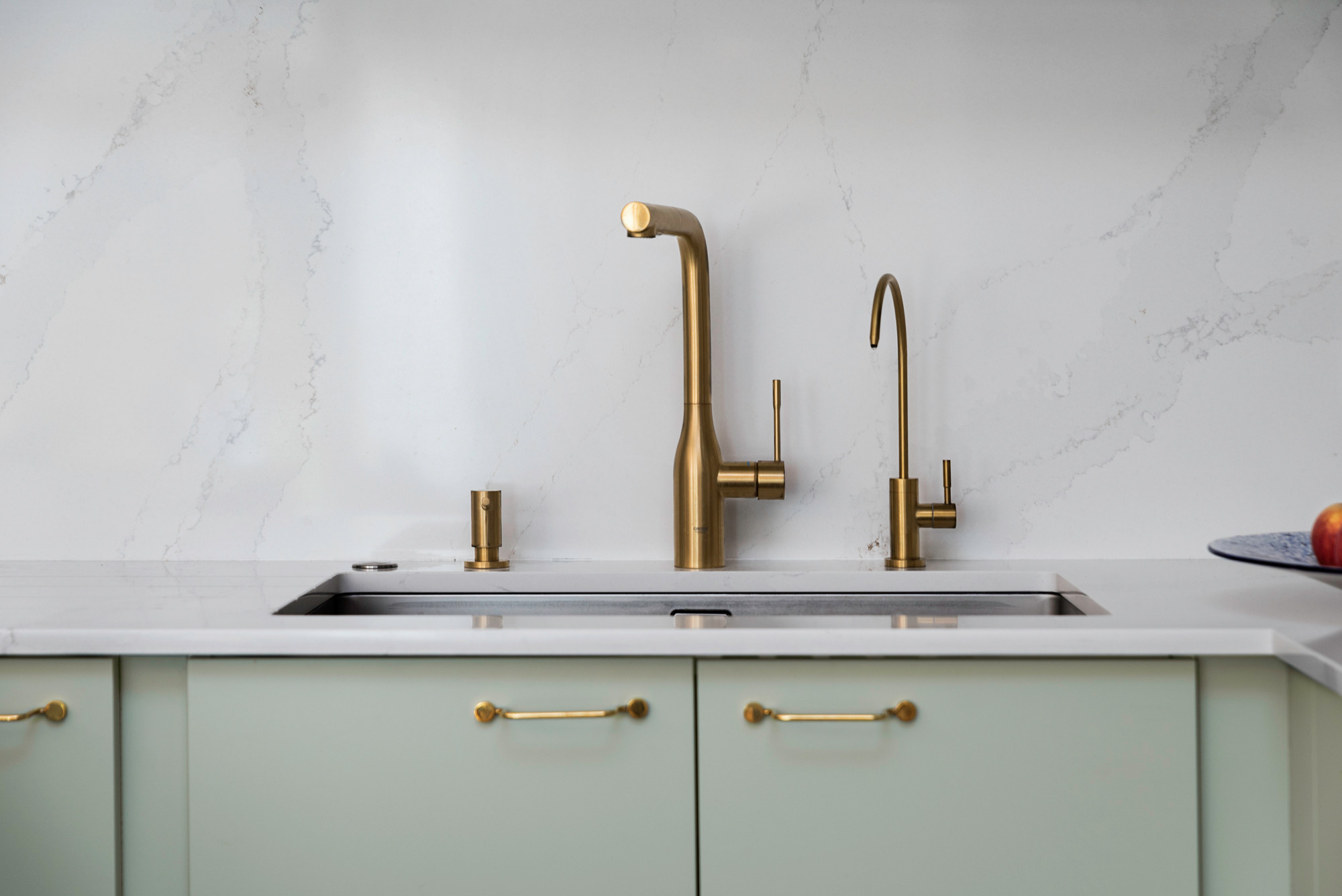 Cette nouvelle cuisine en U adopte une crédence et un plan de travail en Silestone Calacatta Gold. Résistant et durable, ce quartz réalisé à partir de poudre minérale et de résine s’associe à une robinetterie en laiton pour la touche précieuse.