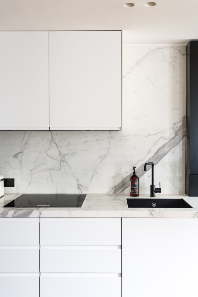 L’architecte d’intérieur Mathieu Tran Nguyen a opté pour une crédence et un plan de travail en grès cérame imitation marbre pour habiller cette cuisine immaculée.