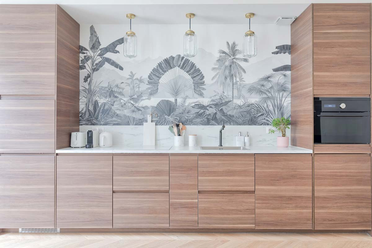 Dans la pièce à vivre, l’architecte d’intérieur a imaginé une cuisine linéaire en bois clair, animée par un spectaculaire papier peint exotique invitant au voyage. Ce papier peint lavable s’accompagne d’un dosseret effet marbre en stratifié pour protéger efficacement le bas du mur.