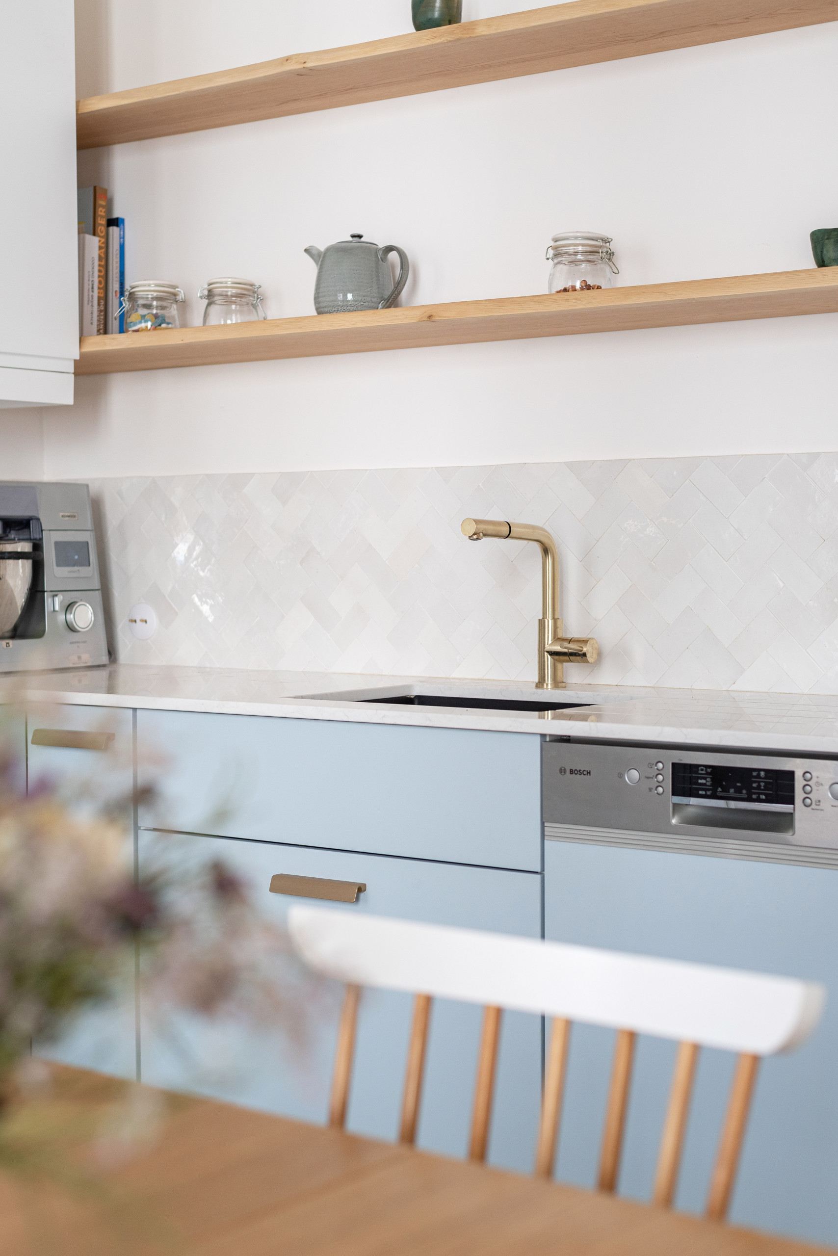 Dans cet appartement haussmanien du IXe arrondissement parisien, l’architecte d’intérieur Alexandra Gorla, de l’agence LD&CO.Paris, a misé sur une crédence en zelliges blancs qui apporte un maximum de luminosité dans cet espace mariant bois clair et mobilier bleu glacier.