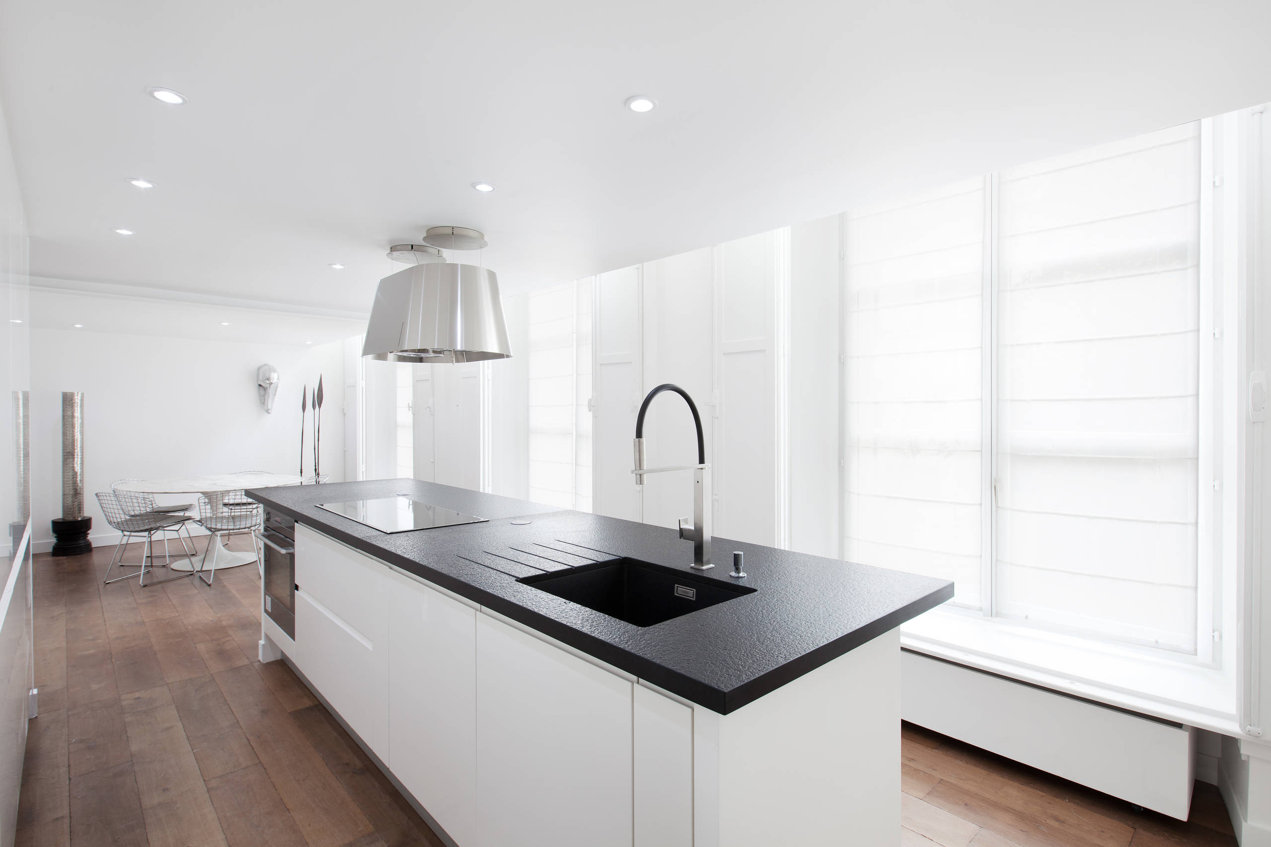 « J’utilise très souvent le granit flammé brossé qui provient du Zimbabwe », explique l’architecte Thibaut Febrer. « J’aime son aspect mat et lisse qui ressemble presque à du cuir, comme ici, où il est légèrement bosselé. Je trouve qu’il est intéressant de l’associer à un évier et des plaques de cuisson noirs, pour un effet masse. Il résiste bien aux rayures et à la chaleur, mais il faut reconnaître que dans sa version mate, il supporte mal les taches de doigts et de gras. »
