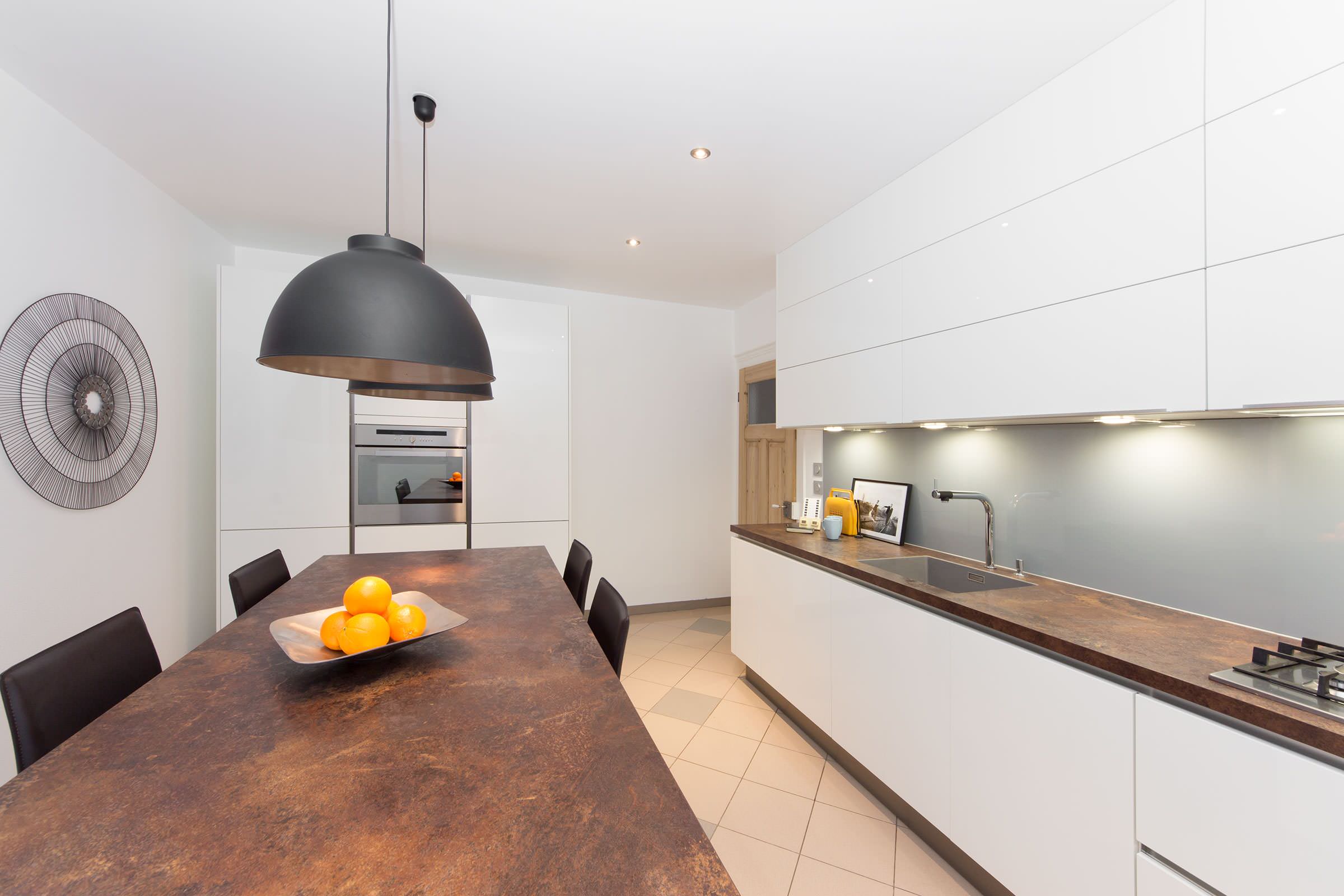 Ici, le procédé est différent. Une feuille de céramique recouvre un plan de travail en bois. « Je fais réaliser ce type de meuble par un granitier », explique l’architecte Laurent Munch. « La céramique est ainsi chauffée à plus de 1300° avec un mélange choisi de colorants et composants. Bien sûr, la fabrication est un peu chère, mais il y a de plus en plus de demandes car ces plans de travail sont inrayables et non poreux. »