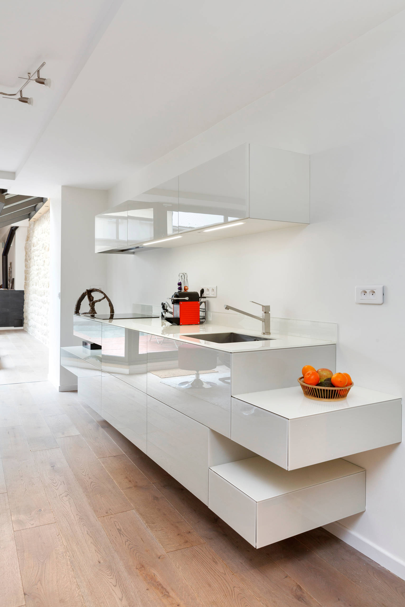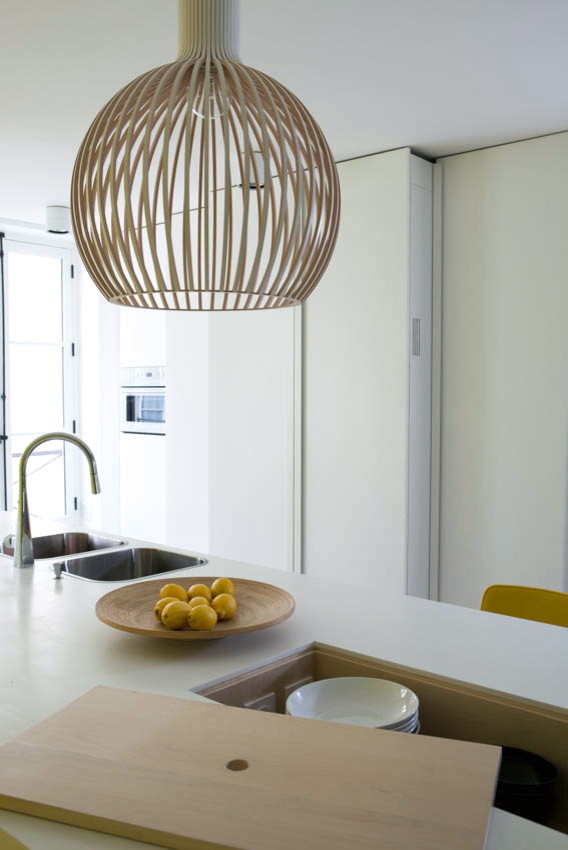 Matière chic composée de résine de synthèse, le Corian est très doux au toucher et particulièrement résistant aux chocs. « C’est surtout le seul matériau qui permette d’avoir une longueur aussi importante, sans raccord visible. Ici, 4,40 m ! Les plaques de Corian sont collées ensemble, comme soudées, puis reponcées de sorte que le joint est parfaitement invisible », précise Vincent du cabinet Feld Architecture qui a réalisé le projet ci-dessus.