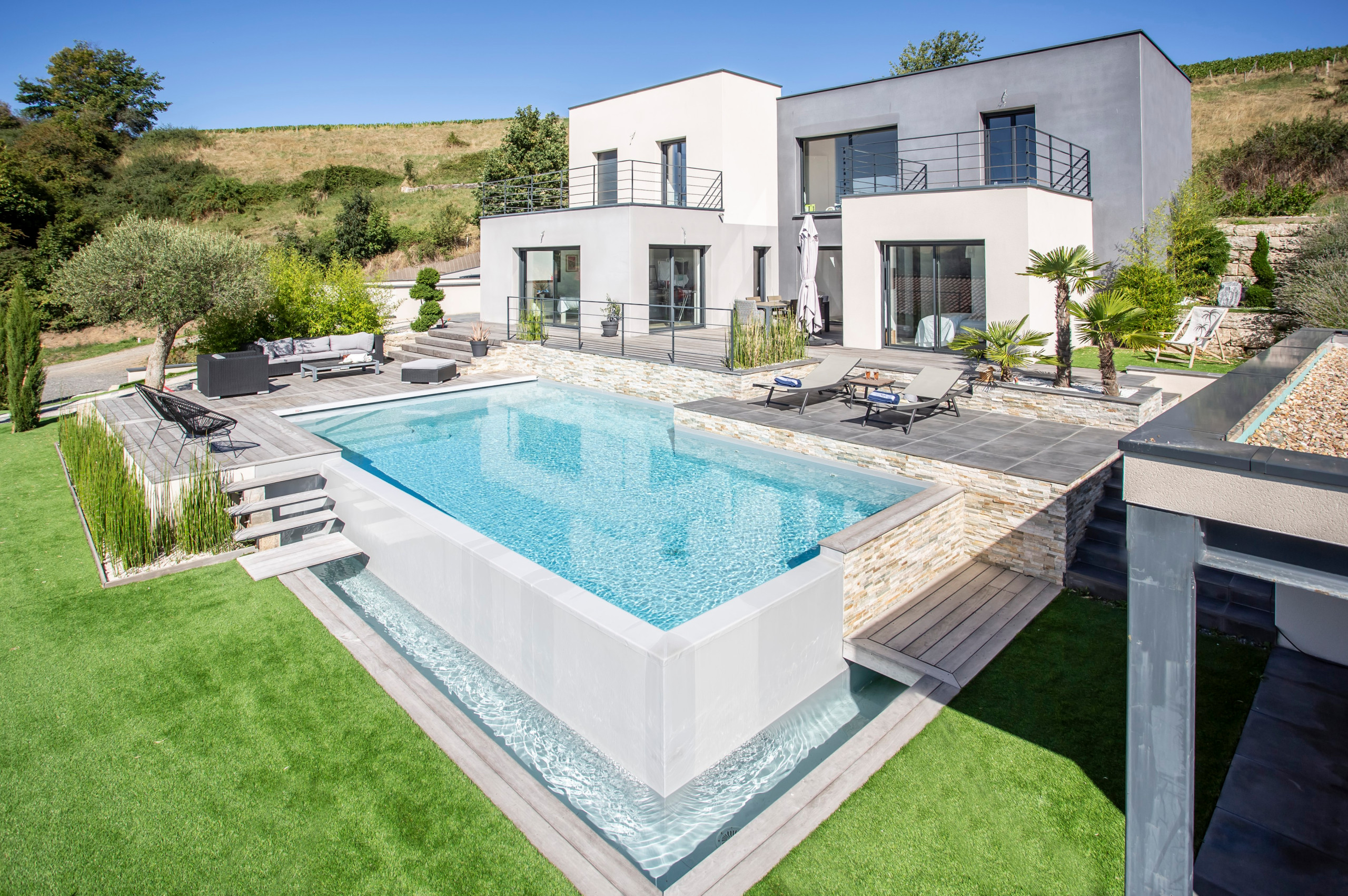 Avec ses lignes nettes et son bassin à débordement, cette piscine signée Everblue Piscines France s’intègre parfaitement au terrain en pente.