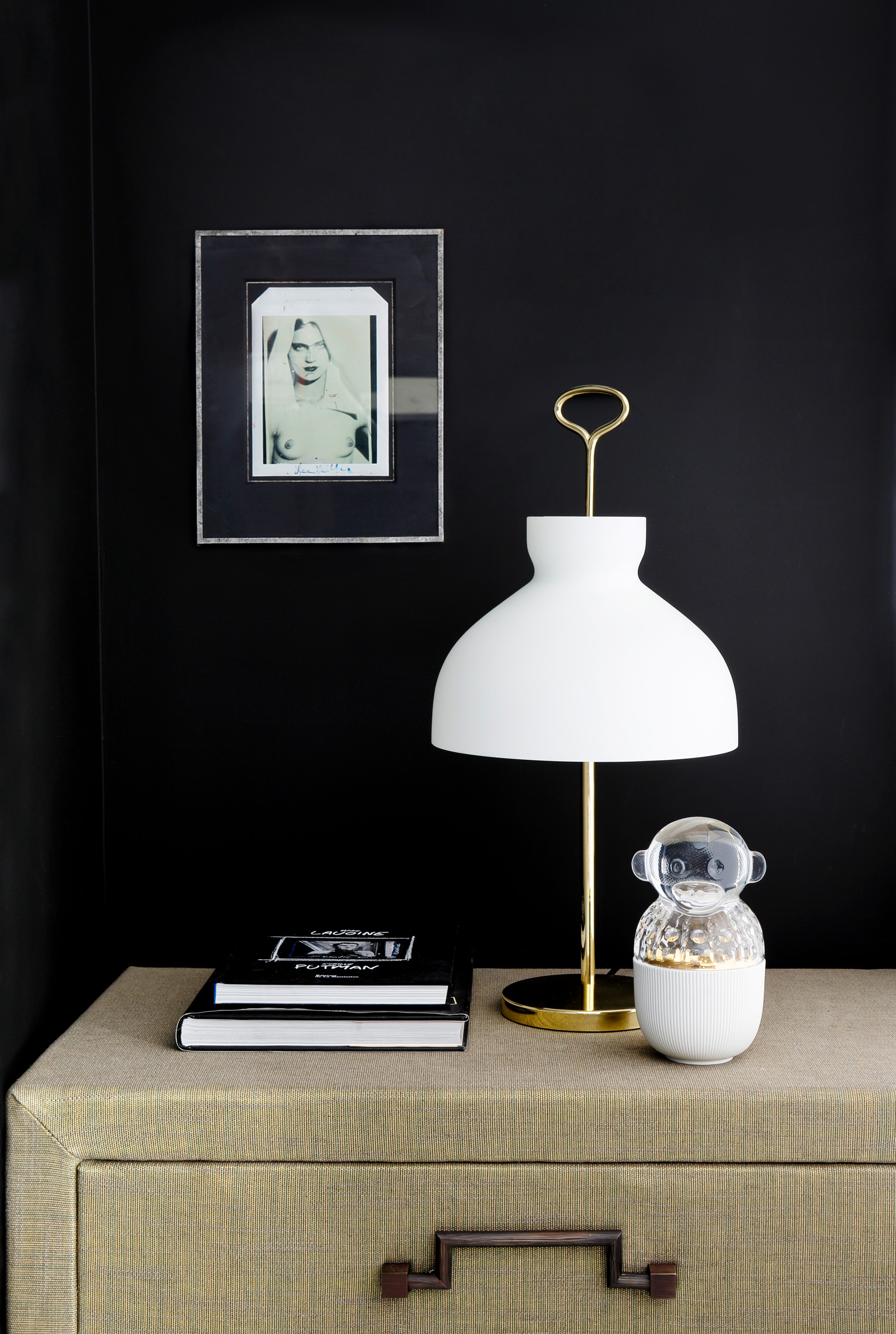 Des lignes brutes, graphiques sont associées à un fort contraste entre le blanc et le noir. Tout est savamment choisi : les livres dont la tranche blanche est visible, une lampe blanche, un tableau rectangulaire noir et blanc dont l’encadrement est blanc… Observez tout de même que l’ensemble n’est pas si froid. La raison tient à la matière, et non à la couleur : le noir des murs est mat, la commode est en bois brut, à peine traité, donc mat également. Cela augmente le contraste avec la lampe, mais apporte de la douceur.