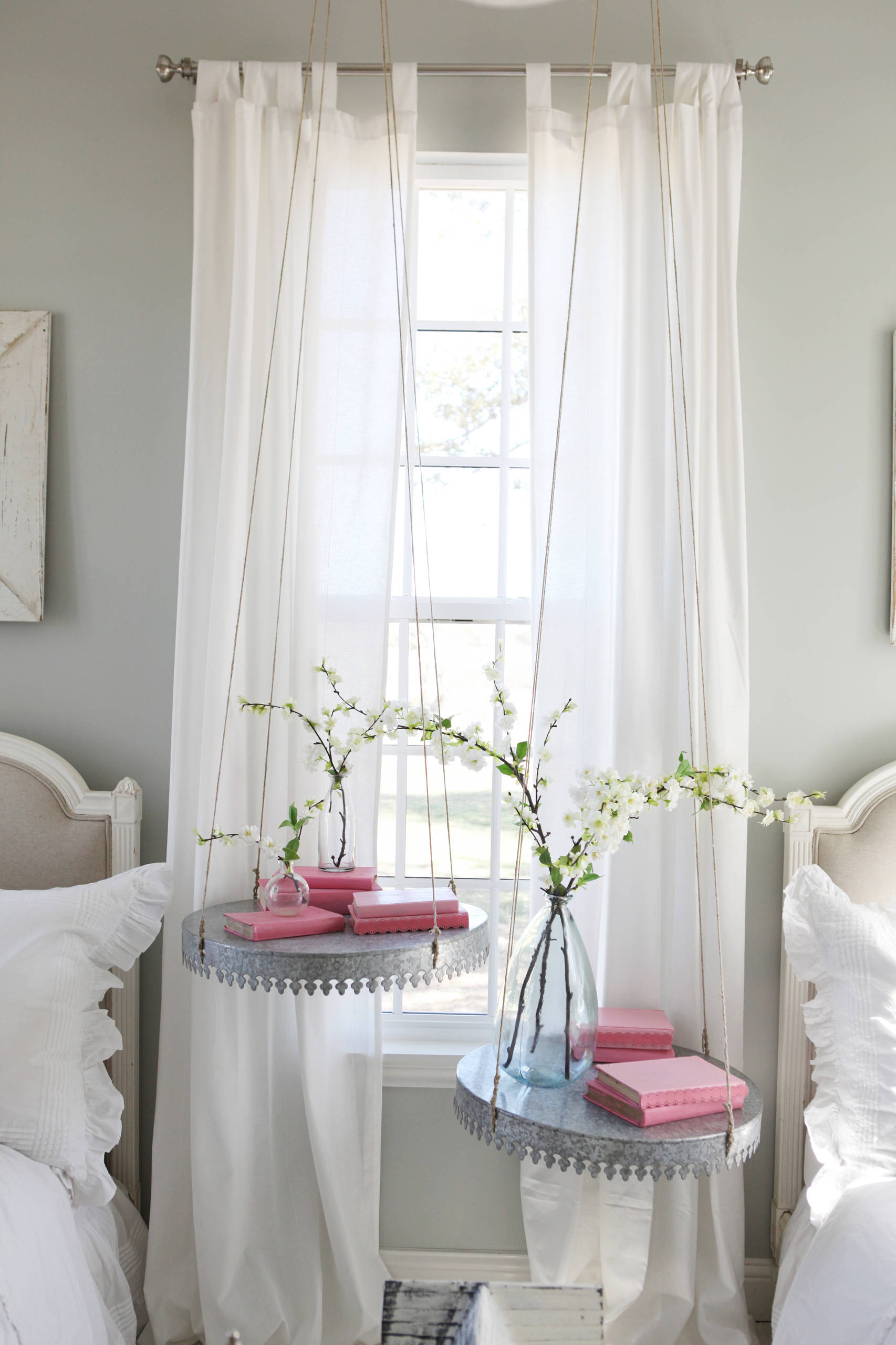 L’ambiance de la chambre est très féminine. Des tons poudrés, des voilages aériens… Pour compléter ce décor, deux plateaux argentés ont été suspendus devant la fenêtre, et servent de tables de chevet légères comme des plumes. La seule touche de couleur est apportée par le rose des petits objets. Quelques brins de verdure complètent l’ambiance dans deux vases très simples.
